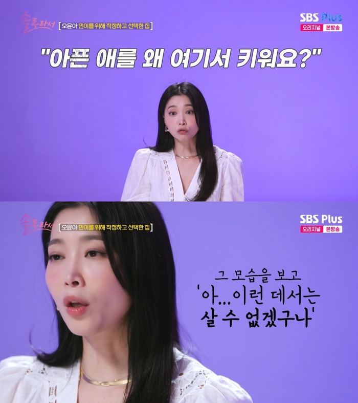‘솔로라서’.사진ISBSPlus,E채널‘솔로라서’방송캡처배우오윤아가단독주택으로이사한이유를밝혔다.22일방송된SBSPlus,E채널‘솔로라서’에서는오윤아의일상이그려졌다.이날오윤아는경기도에있는단독주택에사는이유에대해“서울에서아이를키울만한곳이없었다.주변사람들이너무불편해했다.아이가소리를내니까.아이가아파서그런다고하면‘아픈애를왜여기서키우냐’고하더라.그런이야기들을듣다보니까아이도자연스럽게사람들눈을피하게됐다”고말했다.오윤아는이사를결심한결정적이유에대해“촬영끝나고왔는데아이가아파트계단에앉아서동화책을읽고있었다.그걸보고이런데에서살수없겠구나싶었다.아이가처량해보이고새장에갇힌아이처럼보였다.아이가마음껏뛰어놀고소리지를수있는곳으로가야겠다싶었다”고했다.이어“일하는곳과거리가멀긴하지만아이가편하니까나도마음이편해졌다”고덧붙였다.한편‘솔로라서’는매주화요일오후8시30분방송된다.[이세빈스타투데이객원기자]Copyright©스타투데이.무단전재,재배포및AI학습이용금지