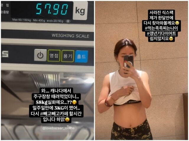안선영./소셜미디어[마이데일리=곽명동기자]방송인안선영이다이어트를선언했다.안선영은21일개인계정에“와캐나다에서주구장창때려먹었더니58kg실화예요?일주일만에3kg이쪘어”라며57.8kg를가리키는체중계를공개했다.이어“사라진식스팩제가한달안에다시찾아와볼게요.먹는족족찌는나이.갱년기다이어트쉽지않지요”라며“감자튀김햄버거맥주라면주구장창이런걸일주일내내먹었으니몸이이렇게안예쁘게배둘레햄으로만와서들러붙었지말입니다.먹는것이곧나자신”이라고했다.영상속안선영은배의이곳저곳을만지며살이얼마나쪘는지체크하는모습이다.한편안선영은지난해한예능에출연해"홈쇼핑매출1조원은진작에넘었다.함께한4개브랜드가상장했다"고자랑해화제를모은바있다.안선영은지난2013년3살연하의사업가와결혼해슬하에아들을두고있다.Copyright©마이데일리.무단전재및재배포금지.