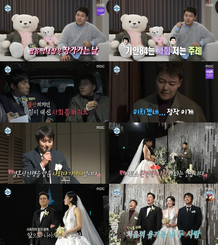 ‘나혼자산다’.사진IMBC‘나혼자산다’방송캡처배우이장우,조혜원의결혼식이공개됐다.5일방송된MBC‘나혼자산다’에서는이장우의결혼식현장이공개됐다.이날전현무는“이장우가드디어결혼을한다.더불어나랑기안84는핫데뷔를한다.나는주례자로기안84는사회자로데뷔한다”며미소지었다.전현무,기안84는숍에서헤어,메이크업을받은후택시를타고결혼식장으로향했다.기안84는결혼식사회유경험자인전현무에게조언을구하는가하면“나진짜불안해지면대신사회좀봐달라”며긴장한모습을보였다.전현무역시처음맡는주례에긴장을떨치지못했다.결혼식장에도착한전현무,기안84는이장우를만났고,이장우는주례,사회를맡아준것에감사함을담아준비한부토니에를달아줬다.전현무,기안84는각자의자리에서멘트연습에돌입했다.전현무는“긴장되는게남의인생이걸려있어서그렇다.신랑,신부,아버지,어머니가우리만의지하지않냐.누가도와줄수가없으니까”라고이야기했다.무지개회원중가장먼저결혼식장에도착한사람은박나래였다.뒤이어구성환,박지현,코드쿤스트,고강용,안재현,이주승,김대호등이도착했다.키는해외스케줄때문에불참했다.구성환은하객으로꽉찬결혼식장을둘러보며“이장우가잘살았다”고감탄했다.기안84의멘트와함께시작된결혼식.이장우는신랑입장을마치고조혜원을기다렸다.조혜원은눈시울이붉어진채버진로드를걸었다.신부입장을지켜보던박나래는“눈물날것같다”고울먹였다.드디어전현무의주례순서가다가왔다.전현무는“이장우가주례를부탁했을때처음에는당황했다”고말문을열며주례를위해책까지구매했다고밝혔다.전현무는이장우,조혜원을위한덕담을건네며주례를이어갔다.그러나전현무의주례가길어지자무지개회원들은지루함을감추지못했다.박나래는“전현무도어쩔수없다.주례하니까재미없다”고농담했다.그런가하면이장우는무지개스튜디오에깜짝방문해눈길을끌었다.마지막인사를하기위해무지개스튜디오에방문했다는것.이장우는“30대를무지개회원들이랑보냈다.덕분에남부럽지않은삶을살았다.아직실감이잘안난다.이게어떤기분인지는잘모르겠지만내30대를같이해주고행복하게채워줘서너무감사하다.나는보란듯이잘살겠다”고인사했다.이후전현무는무지개회원을대표해이장우에게감사패,꽃다발등을건넸다.이어“잘살아라.잘사는걸로보답해라”라며결혼을축하했다.[이세빈스타투데이객원기자]Copyright©스타투데이.무단전재,재배포및AI학습이용금지