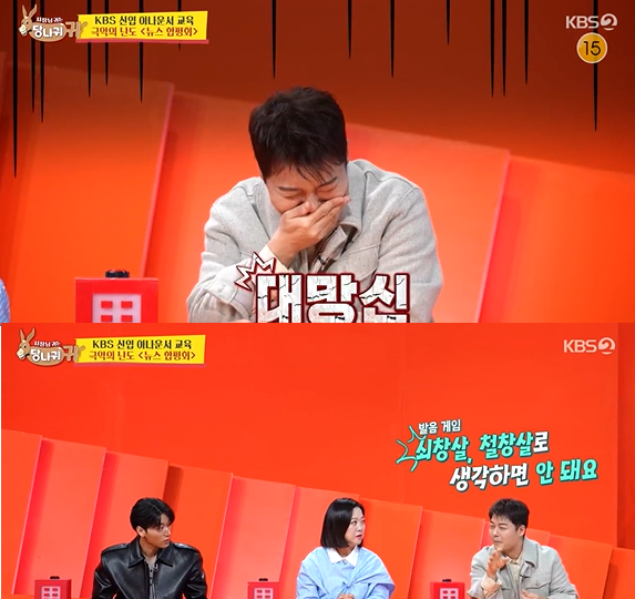 전현무,뉴스속보읽다가'삑사리'..현장웃음바다(MHN김소영기자)'사당귀'에서긴장감넘치는아나운서합평회를보여줘시청자들의관심을끌었다.1일KBS2'사장님귀는당나귀귀'(이하'사당귀')342회에서는KBS신입아나운서교육현장이전파를탔다.선배아나운서들은발음의세세한부분까지지적하며프로페셔널한모습을보였고,박명수는"진짜배울점이많다.합평회는꼭해야되겠다"라고말했다.한선배아나운서는"외모지적을해야겠다"며"귀가많이빨개진다.프로로보이느냐아니냐에큰차이를보일수있다"라고말하며필요하다면귀메이크업을하는것을조언했다.이날스페셜MC로출연한에이티즈산은뉴스앵커대본을즉석에서읽었다.이를보던아나운서출신방송인전현무는"발음이중요한게아니라내용이중요하다"라고조언하며직접시범을보였다.자신감넘치던모습과달리그는속보내용을말하던중발음을틀려웃음을자아냈다.전현무는부끄러운듯고개를들지못했다.한편이날전현무는에이티즈산의열렬한팬임을밝혀놀라움을줬다.그는"콘서트를해외로보러가지는않는다"며"에이티즈가퍼포먼스장인이란소문을듣고도쿄에가서공연을봤다.산씨혼자댄스를하는부분이있는데정말섹시하더라"라고칭찬했다.사진=KBS2Copyright©MHN.무단전재및재배포금지.