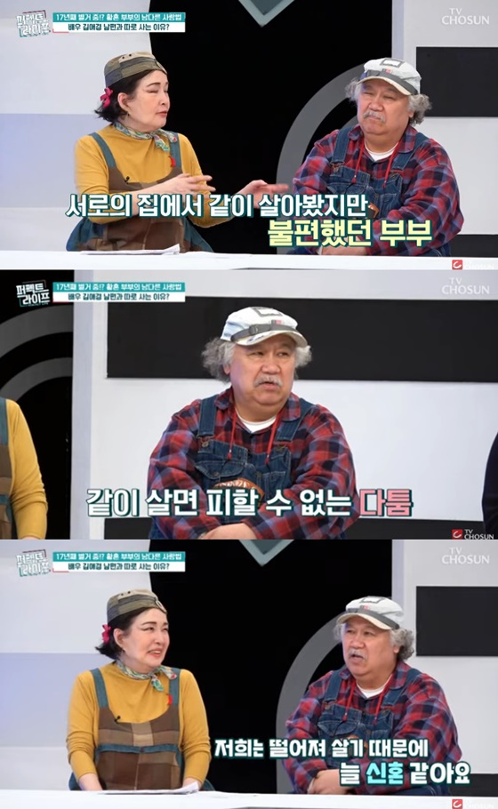 [스타뉴스|최혜진기자]/사진=TV조선배우김애경이남편과별거중이라고고백했다.16일방송된TV조선교양프로그램'퍼펙트라이프'에는김애경과5세연하남편이출연해'따로또같이'하는부부일상을공개했다.이날김애경은남편과2008년결혼후지금까지별거중이라고밝혔다.그는"우리가50대후반에늦게만났다.그러니까각자오랜습관이몸에배어있다.남편은아침형이고난야행성"이라고설명했다.이어"같이살아보려고일주일동안살아봤는데서로불편했다.그래서남편하고결혼했지만안한듯,안했지만한듯자유롭게살자고했다"며별거를하게된이유를밝혔다.이를들은남편은"같이살면여러가지트러블이많이생기는데우리는떨어져살아서늘신혼같다"고전했다.한편김애경은지난1969년MBC1기공채탤런트로데뷔했다.특히그는KBS드라마'서울뚝배기'에서"실례합니다~"라는유행어로큰사랑을받았다.최혜진기자[email protected]©스타뉴스&starnewskorea.com,무단전재및재배포금지