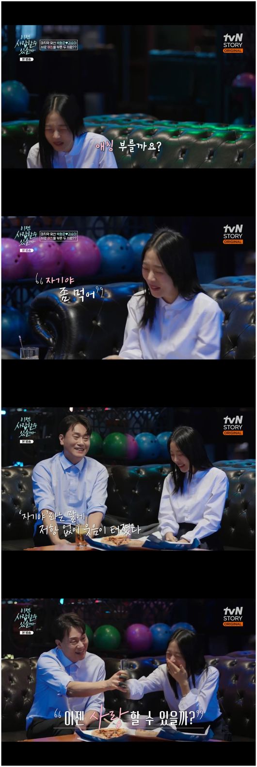 [OSEN=오세진기자]‘이젠사랑할수있을까’박형준이세번째맞선녀김승미와애칭을터놓는달달한모습을보였다.14일방영한TV조선‘조선의사랑꾼’에서는박형준이세번째맞선녀김승미와식사후마사지,그리고볼링을치러갔다.박형준은“이따음식도먹으면서운동도할수있는데를가시겠냐”라며데이트코스를제안했다.그곳은볼링펍이었다.김승미는“제가이기면자기야,형준님이이기면제게애기야,이렇게부르셔야한다”라며재치있는내기를건넸다.이에박형준은요리하는김승미를위해테이핑을해줄생각까지하며달달한모습을보였다.김승미는내기이지만박형준을기꺼이응원했다.박형준은“저오랜만에왔는데,응원해줘서그런지,스트라이크도치고그랬다”라며김승미덕분이라고말했다.김승미는“제가졌으니까애칭부를까요?”라고말한후쑥스러운지환하게웃다가"자기야"라고말해박형준을밝게웃게만들었다./[email protected][사진]TV조선‘조선의사랑꾼’Copyright©OSEN.무단전재및재배포금지.