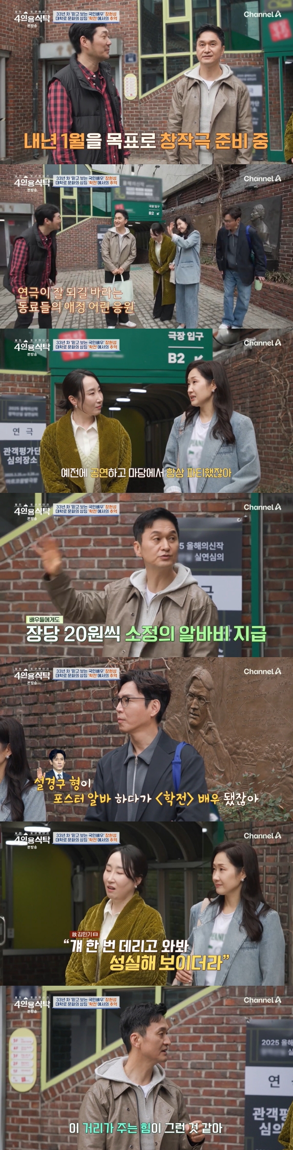 채널A‘절친토큐멘터리4인용식탁’캡처채널A‘절친토큐멘터리4인용식탁’캡처[뉴스엔유경상기자]장현성이연극하던시절추억과함께배우설경구를언급했다.4월14일방송된채널A‘절친토큐멘터리4인용식탁’에서는33년차배우장현성(54세)이절친최원영,배해선,김국희를초대했다.장현성이초대한후배배해선,김국희는모두극단학전출신.최원영은“형님이누구초대했다고말해주셔서연결고리가나는애매하더라.세분다학전출신이다.내가껴도되나?그런생각이들었다”고털어놨다.장현성이“하지만약간기뻤지?”라고묻자최원영은“반학전느낌”이라고답했다.장현성은대학로에서옛학전으로가던길을걸으며후배배해선,김국희에대해“학전후배들은많은데이친구들이보여주는연기와태도가깜짝놀랄만하다.내가자랑스러워한다.우리가걸어온길이출퇴근하던길이다.길은똑같은데많은게바뀌었다”고말했다.이어“학전은대단한게배우를함부로대하지않았다.포스터를붙여도장당20원을줬다.설경구형이포스터알바를하다가배우가됐다”며설경구가극단배우가아닐당시포스터붙이는아르바이트를하다가성실해보인다는이유로캐스팅이됐다고설명했다.또장현성은“아까박근형선배님을만났다.다음작품준비하면서점심먹으러나오셨다고.이거리가그렇다.20대후배들부터박근형선배님까지거리전체에열정이가득하다”고말했다.(사진=채널A‘절친토큐멘터리4인용식탁’캡처)뉴스엔유경상yooks@기사제보및보도자료[email protected]ⓒ뉴스엔.무단전재&재배포금지Copyright©뉴스엔.무단전재및재배포금지.