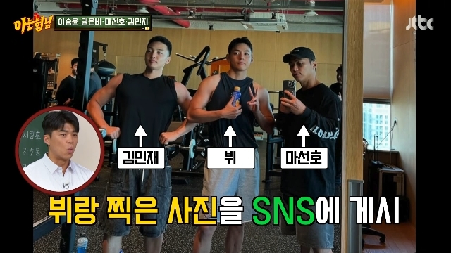 JTBC‘아는형님’캡처JTBC‘아는형님’캡처[뉴스엔서유나기자]보디빌더겸방송인마선호가BTS(방탄소년단)뷔와의친분을과시했다.4월12일방송된JTBC예능'아는형님'(이하'아형')477회에는이승윤,권은비,김민지,마선호가게스트로출연했다.이날마선호는형님들에게"태형이라고알아?"라고물었다.마선호가말한'태형이'는BTS뷔였다.마선호는"난근육으로친분이생겼다.(본명인)태형이라고부른다"고자랑했다.그는"종국형과같이면회를한번갔다.면회가서거기군인들20,30명있잖나.그친구들PT싹다해주고맛있는거사주고운동을2시간알려주고왔다.그러고나서태형이랑인연이생겨서사진을찍게됐다.그사진을소셜계정에올렸는데단한장의사진에팔로워5만명이늘었다"며"아직도아미들에게'태형이밥잘먹었는지물어봐주세요'라는DM이온다"고밝혔다.뉴스엔서유나stranger77@기사제보및보도자료[email protected]ⓒ뉴스엔.무단전재&재배포금지Copyright©뉴스엔.무단전재및재배포금지.