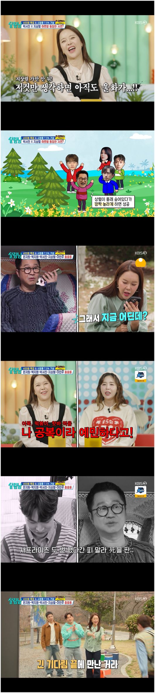 [OSEN=오세진기자]'살림남2'지상렬이깜짝카메라를꾸몄다.12일방영된KBS2TV예능'살림남2'에서는400회특집&시청률7.5%달성을기념해박서진의집방문이그려졌다.모이기전날박서진의집에도착한지상렬은하룻밤푹자고난후“터가좋다.하룻밤잤는데3일잔것같다”라며너스레를떨었다.지상렬은“은지원,백지영,이민우가오기전에지상렬이못온걸로하는깜짝카메라를하자”라며박서진에게제안했다.백지영은“이렇게된거였구나?나는정말저날만생각하면울화가”라며VCR을보던중화를냈다.백지영은첫번째로도착한줄알고지상렬에게전화했다.지상렬은“나이천이야.이천”이라고말했고,백지영은“뭐?10분안에와.끊어”라며화를냈다.박서진은“가방에핸드폰을넣어둬야겠다”라며백지영의전화를피했다.이내백지영은버스에서갑작스레나타난지상렬을보고경악했다.은지원은“저정도로놀라면아프리카가서사자를마주쳐도안질듯”라고놀렸다.신지는“지상렬은먼저와있으면왔지,늦게오진않는다”라고평했고,지상렬은“나는어젯밤에하룻밤자고이렇게온거다.서진이네서잤다”라고설명했다./[email protected][사진]KBS2TV예능'살림남2'방송화면캡처Copyright©OSEN.무단전재및재배포금지.