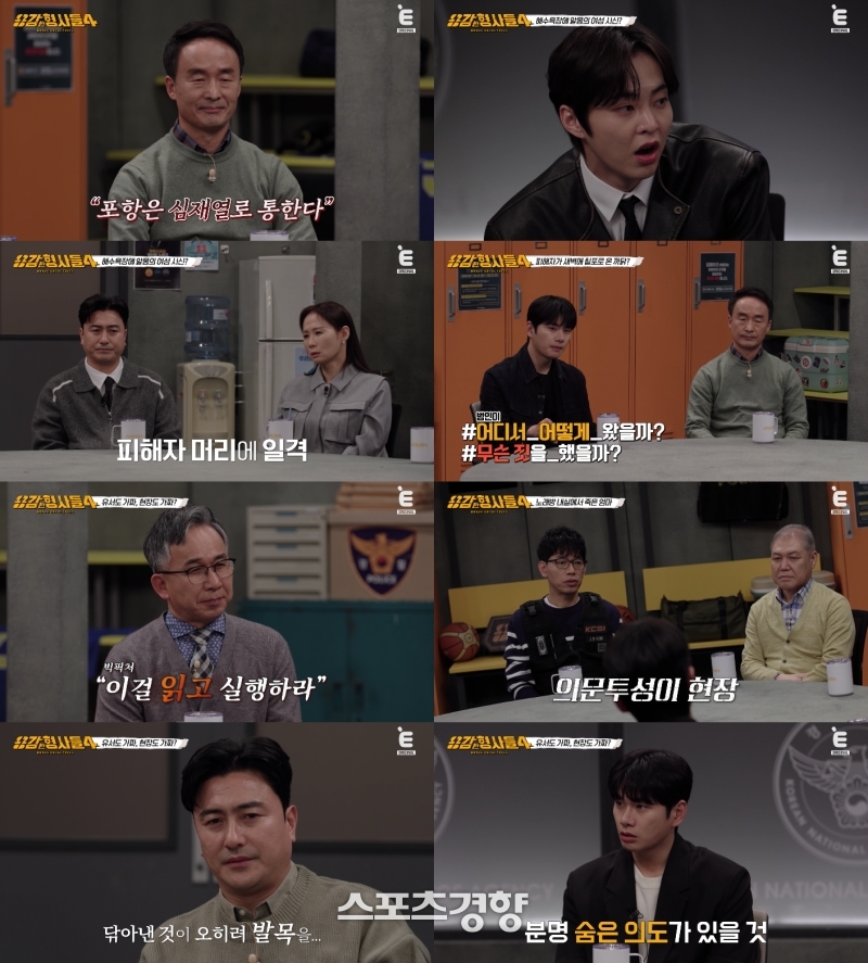 CCTV없는해변사건유서출력해범행위장현장흔적이결정적단서‘용감한형사들4’방송화면.티캐스트방송화면티캐스트프로그램‘용감한형사들4’에서잔혹한범행을저지른뒤태연하게일상을이어간피의자의정체가공개됐다.지난11일방송된‘용감한형사들4’29회에는포항북부경찰서형사5팀심재열경감과과학수사대출신윤외출전경무관김진수경감이출연해직접수사한사건을소개했다.첫번째사건은해수욕장에서알몸으로쓰러진20대여성의변사체가발견되며시작됐다.현장에는귀금속이그대로남아있었고옷과소지품은사라진상태였다.전날내린비로인해모래사장에남은타이어자국과족적이단서가됐다.현장에는CCTV가없어수사는난항을겪었다.피해자는22세대학생으로사건당일후배와함께클럽을방문해두남성과합석했다.피해자는그중한명의차량에동승해귀가했고후배는만취상태로인상착의만희미하게기억했다.수사팀은인근편의점CCTV에서용의자를특정했고기지국접속정보와차량흔적으로좁혀갔다.수상한28세남성은조사당일음독을시도했고자택에서는피해자의DNA와일치하는혈흔과CCTV속바지가발견됐다.피의자는성관계후고소협박을우려해살해했다고진술했다.검거전까지80일동안정상출근을이어갔다.재판에서는우발적범행으로판단돼징역15년을선고받았다.두번째사건은어머니와연락이끊겼다는딸의신고에서시작됐다.현장에서피해자는가슴과손목에상처를입은채발견됐다.주변에는피묻은칼과유서로보이는문서가있었다.유서에는계좌비밀번호와자녀에게남기는메시지가포함돼있었지만자필이아닌출력물이었고말투역시달랐다.현장감식결과피해자의옷에는칼자국이없었고혈흔도거의남아있지않았다.루미놀검사에서는혈흔제거흔적이확인됐고피해자가입은치마에는혈흔이전혀없었다.유서내용과실제정황사이의괴리도있었다.막내아들은사건당일어머니가청바지를입고있었다고진술했고치마외에청테이프조각이붙은청바지가따로발견됐다.부검결과손목상처는사후에생긴것이었다.수사는둘째딸의남자친구로향했다.그는폭력전과가있는이혼남으로사건전피해자에게결혼을요구하며접근해왔다.유서에는해당남성과의결혼을권유하는문장이있었고유산분배방식역시남자친구에게유리하게기술돼있었다.유서에서남자친구의지문이발견되며검거됐다.피의자는피해자집의사위를자처했으나무시당한것에분노해범행했다고진술했다.피해자에게서받은비밀번호를이용해유서를꾸몄고도장과열쇠까지조작했다.그는무기징역을선고받았고선처는받아들여지지않았다.‘용감한형사들4’는매주금요일밤9시50분에방송된다.티빙넷플릭스웨이브등에서도시청할수있다.프로그램관련영상과내용은유튜브와인스타그램계정을통해제공된다.이선명기자[email protected]©스포츠경향.무단전재및재배포금지.