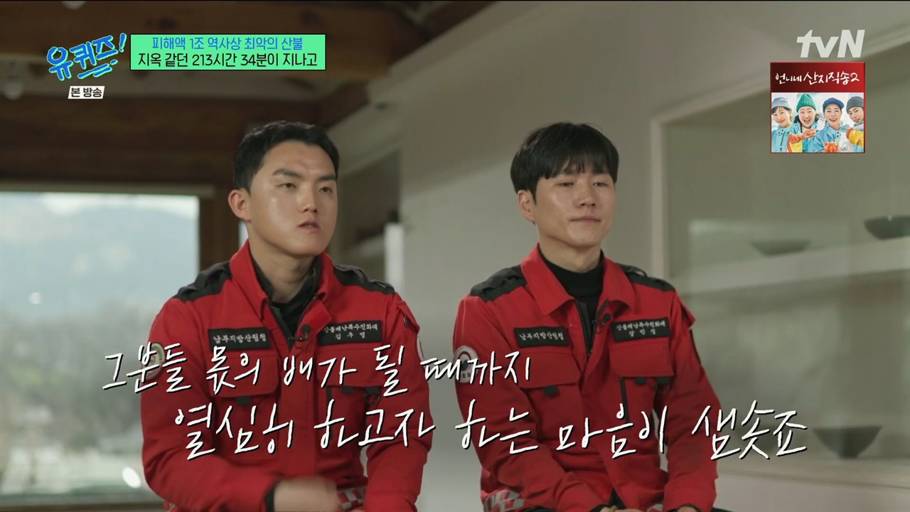 [리뷰]tvN유퀴즈>[이준목기자]"눈앞에서불이올라오는장면은상상을초월한다.불길이나무높이보다더높게올라가고,속도도너무빨랐다.인지하는순간이미불은올라가있었다.무시무시했다.앞을보니불이붙으면온통빨갛고마치악마가속삭이는듯무서운소리가나더라.그때'여기가지옥이겠구나'싶은생각이들었다."사상최악의화마를진압하기위하여사선을넘나들며분투한영웅들의이야기가시청자들의감동을자아냈다.9일방송된tvN<유퀴즈온더블럭>에서는'산불재난특수진화대'김우영-강민성대원이출연해산불사태의뒷이야기를전했다.2025년3월영남권에서시작된대규모산불사태는대한민국역사상가장피해규모가컸던산불로기록되어우리사회에큰충격과숙제를남겼다."이번산불,정말심각하겠다"▲<유퀴즈온더블럭>에출연한특수진화대ⓒtvN김우영대원은지난3월21일에퇴근을준비하던중상황실에서산청산불이심상치않은것을보고대기하고있었다.우려한대로대응3단계가발령되고대원들은곧바로현장에투입됐다.밤10시경,대원들이경남산청에도착했을때,산의능선을따라서화선이길게뻗어있었다.여기에강풍으로인하여불씨가휘날리고불기둥이치솟으며위태로운상황이었다.김우영대원은이를보고"이번산불이정말심각하겠다"는것을직감했다.대원들이처음현장에투입된시간이늦은밤이었기때문에화재진압헬기는뜰수없었다.김우영대원은"그래서야간에는지상인력의역할이중요하다.대원들이불을발견하면밤새물을뿌리며어느정도불길을잡아줘야아침에헬기들이연무가없는상황에서수월하게진화작업이가능하다"고설명했다.특수진화대는산불이가장발생하면가장먼저최전선에투입되는대원들이다.불을끄기위해서는불의머리까지진입해야하는만큼대원들은20kg에이르는무거운호스를지고가파른산비탈을두발로올라화마의최전선과마주해야했다.화재발생시열기는최대약1200도까지올라간다.상상을초월하는높은기온으로인하여현장에투입된대원들의머리카락과눈썹까지타버린경우도있다고.훈련된대원들조차30초도버티기힘든극한의환경이었다.김우영대원은"'그래도해야지'라는생각에물을몸에뿌려가며버티기도한다"면서"호스물을몸에뿌리고나서야간이되면추워진다.그러다가불길앞에가면너무뜨겁다.그런상황이진화내내반복된다"는고충을설명했다.이어"24시간내내화재진화를하다보면나도모르게혼이빠질때도있고위험한순간도있다.야간에는불만이아니라추위,졸음과도싸워야하기에더위험하다"고덧붙였다.강민성대원은"잠시쏟아지는새벽3-4시가제일고비다.살수하다가깜짝졸기도했다.지금몸이정상이정상이아니구나"라는생각이들었다"고설명했다.현장에투입된대원들은24시간밤샘진화를하면서도야외현장에서아무곳에나잠시기대는걸로휴식을취하는게전부였다.대원들도집에돌아가면누군가의평범한아빠이고형제인만큼,잠못이루고기다리는가족들의걱정도컸다.강민성대원은"어머니전화가자주온다.현장에서는바빠서전화를못받는일이많은데,그러면내내걱정하고계시더라"며미안해했다.김우영대원도"가족만이아니라친척,지인에게서도연락이많이왔는데여전히답을못해준경우가많다"고밝혔다.산불확산의이유산불이민가까지내려오게되면피해는더욱커진다.의성산불당시화마가마을인근까지덮치면서대원들은집마다문을두드리며주민들을긴급하게대피시켜야했다.소중한집을지켜야한다며나가지않고버티는주민들을간곡히설득하느라진땀을빼기도했다.다행히주민들을대피시킨후진화차량을투입하면서화마로부터무사히마을을지켜낼수있었다.이번산불이크게확산된또다른이유는,강풍을타고불씨가사방으로번졌기때문이었다.김우영대원은"바람이정말위험한게,산속으로들어가면바람방향이바뀔때가있다.바람방향을예측하는게정말힘들다.바람이많이불면불씨가대원들뒤쪽에떨어지기도하여위험한순간들이많다"고설명했다.실제로화재를진화하던대원들이바람으로인하여오히려불길에갇히는아찔한상황이펼쳐지기도했다.김대원은"빨리진화하고싶은마음에계속앞으로나아가고있었는데,무전으로'빨리내려오라'는다급한연락을받았다.돌아보니뒤에서돌풍이불면서불이올라오고있더라"고아찔했던순간을회상했다.다행스럽게도무사히탈출하기는했지만,눈앞가까이에서섬뜩하게다가오는불길을봤을때는마치지옥을실제로눈앞에보는듯한두려움까지느꼈다.이처럼산전수전다겪은대원들에게도이번현장은충격과당혹의연속이었다.대원들은하나의화선을진압하고겨우마무리하자마자,뒤에또다른화선을발견했던순간을떠올렸다."한숨이나오더라.저희가다꺼야하니까"라면서"저능선까지만잡으면끝이겠지하고올라섰는데그이상으로능선에불이이어져있을때는어떡해야하나막막할때가있었다"고회상했다.인간이저지른부주의와실수는약1조원이상넘는엄청난피해로돌아왔다.현재산불원인에대한조사가진행중인가운데,경남산청의산불은한농가의예초기에서튄불꽃때문에,경북의성산불은성묘객의실화에서비롯된것으로추정된다.김우영대원은"저희도사람이니까.불끄는와중에확산소식을접했을때는,불낸사람을생각하니까울화통이터지더