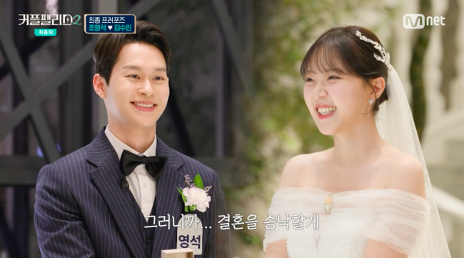[OSEN=박하영기자]‘커플팰리스2’조영석과김수민이최종프러포즈에성공했다.9일방송된Mnet‘커플팰리스2’최종회에서는10주간의대장정에마침표를찍을최종프러포즈결과가공개됐다.확신의커플이었던조영석과김수민.그러나김수민이조영석앞에서전남친을언급하거나술에취해실수를하면서두사람사이는냉랭한분위기로바뀌었다.전날조영석은“집에가고싶다.집에서편안하게쉬고”라고했고,당황하김수민은“근데내일큰거있으니까그거를안하고싶을수도있지”라며“나한테어제실망했을수도있고내가반성해야하는것도맞는데나랑만약에장기적인관계를생각했으면언젠가한번그랬을것같다.이게나야”라고솔직하게털어놨다.이후조영석은커플매니저를통해“새로운모습들을알게돼서마음의거리감이조금생겼다”라고해이목을끌었다.그리고최종프러포즈당일,조영석은김수민에게“김수민같이있으면편안하고즐겁고행복했어”라며과거형으로말해긴장감을더했다.그는“제가조금속상했나봐요제가.그래서그런일들이나그제가느꼈던그런감정들도어떻게보면반드시느껴야만했을그런것들이아닌가”라며“김수민내랑결혼할래?”라고프러포즈를했다.조영석은“모든사람이완벽한사람은없고그게잘못이라고생각안해.차분하게마음을다시돌이켜보니까수민님에대한마음에확신이조금느껴졌다”라고밝혔다.이에김수민은“오빠랑함께하면내가더지혜롭고단단하고멋진사람이될수있을거같아.그러니까결혼승낙할게”라고화답했다.김수민은인터뷰를통해“이런건강한끌림은진짜귀하다고여기고그런사람을커플팰리스통해서만났다”라고전했다./mint1023/@osen.co.kr[사진]‘커플팰리스2’방송화면캡처Copyright©OSEN.무단전재및재배포금지.