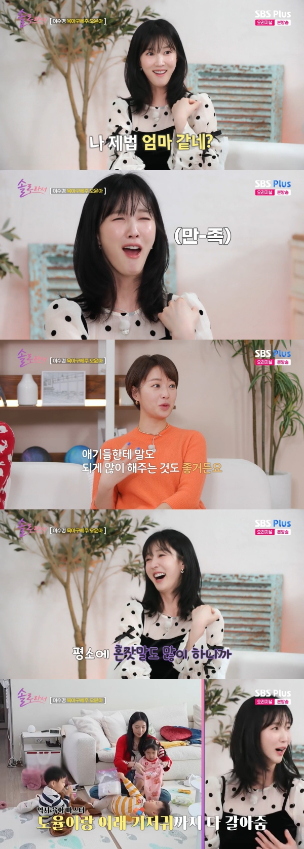 사진=SBSPlus·E채널[스포츠투데이김태형기자]황정음이이수경의육아스킬을칭찬했다.8일방송된SBSPlus·E채널'솔로라서'에는이수경이지인의아이들을돌보는모습이그려졌다.이날이수경은"친한언니의아이들인데,언니가잠깐일이있다고맡아달라고했다.그래서저희집에서아이들과특별한시간을보내게됐다"고설명했다.육아초보인그는지인에게서몇가지를전수받고나서본격적으로삼둥이육아에나섰다.하지만아이들은엄마를찾으며울었고,이수경은점점힘에부치기시작했다.그때오윤아가이수경의집을찾으며지원사격에나섰다.능숙하게아이의울음을달래는모습을본이수경은"3초만이다.내공이다르다.윤아마법"이라고말했다.오윤아가합류하면서힘을얻은이수경은능숙하게기저귀를갈고아이를씻기면서"오구잘하네?"라며달랬다.그는자신의모습을보며"나제법엄마같네?"라며뿌듯해했다.황정음이"아기들한테말도많이해주는게정말좋다.너무잘하고있다"고칭찬하자,이수경은"평소에혼잣말도많이하니까"라며웃었다.[스포츠투데이김태형기자[email protected]]Copyright©스포츠투데이.무단전재및재배포금지.