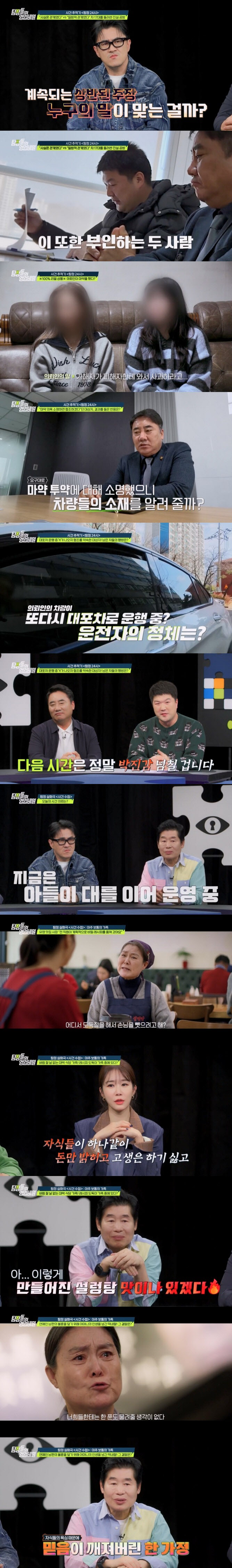 이연복,'탐정들의영업비밀'출연[이데일리스타in김가영기자]채널A생활밀착형탐정실화극‘탐정들의영업비밀’에서‘차량17대’를찾는모녀의의뢰를받고중고차사기사건을추적해온‘갈매기탐정단’이충격적인순간을포착했다.또게스트로찾아온‘중식레전드’이연복셰프는돈에눈먼자식들때문에삶이녹아든설렁탕집을폐업한사장의사연에안타까움과씁쓸함을감추지못했다.7일방송된‘탐정들의영업비밀’에서는‘갈매기탐정단’이지인으로알고지내던남성에게명의대여를해줬다가본적도없는‘차량17대’의차주가되며거액의채무까지떠안은모녀의사건추적을계속했다.그러나의뢰인중어머니쪽의명의를빌려갔던지인남성은의뢰인이자신의잘못을감추기위해판을벌인것이라고주장했다.그는“차량17대모두위치를알고있고바로알려줄수도있다.모두운행정지상태라대포차운영도안된다”고밝혔다.하지만이미전소되고폐차된차량4대의소재를확인한바있는‘갈매기탐정단’이계속해서차량들의행방을추궁하자,남성은“(의뢰인은)마약을했다”며말을돌렸다.남성은그증거로의뢰인이횡설수설하는통화녹음을들려줬다.또“마약쟁이들은바로안다.마약했던애들이통화내용을들어보고는(마약을한게)맞다고했다”며의뢰인의마약투약을확신했다.남성은“채무해결하고싶으면,잘못한짓에대해해명하고사과해라.스토킹신고한것도취소해라”라며엄포를놓았다.탐정단은의뢰인과만나사실관계확인에나섰다.그러나통화녹음속의뢰인은남성이준신경안정제를먹고부작용증상이올라온상태였다.게다가의뢰인은의료기관에서진행한검사의‘음성’결과로자신이마약과관계없음을확인시켜줬다.지인남성의‘사과요청’에의뢰인의딸은“저희가피해자인데,피해자가가해자한테사과해야하느냐”며거절했다.남성은자신이제시한조건이모두무용지물이되자,탐정단에“너희가알아서찾아라”라며말을바꾸고연락을끊어버렸다.그리고남은차량13대중,트럭한대가뺑소니로신고되면서경찰이차주인의뢰인에게연락을취했다.의뢰인은차량을돌려받았고,이를운행했던운전자는해당차량이대포차로이용됐다는증언을해줬다.탐정단은남성에게“법적대응으로저희가할수있는건다하겠다”라고강경하게나섰다.그제야해당남성은“협조하겠다”며또말을바꿨다.이어남성은차량한대의위치를알려줬지만,해당장소에서탐정단은차량을찾을수없었다.주변탐문을이어가던중탐정단은찾던차량과마주쳤고,운행을멈추게한뒤운전자에게“차주세요?”라며질문을건넸다.의뢰인의차량모두가‘운행정지차량’임에도대포차운행장면이포착된가운데,‘갈매기탐정단’은“다음이야기는박진감이넘칠거다”라고예고했다.과연얽히고설킨‘중고차17대사기’사건이어떻게마무리될지궁금증을유발한다.한편,실화재구성코너‘사건수첩-아주보통의가족’에는아들과함께중식당을운영하고있는‘중식대가’이연복셰프가함께했다.이번실화속탐정사무소에는설렁탕집하나로건물까지세워‘전설’이된가게의사장이의뢰인으로찾아왔다.의뢰인은일찍남편을잃고설렁탕집을운영하며홀로삼남매를키워냈다.그리고대통령의입맛까지사로잡은대박집을큰아들에게물려주고편안한노후를보내려했다.그러나큰아들이가게를인수한뒤,홀직원여성이매일손님들과싸우는바람에입소문이점점나빠졌다.결국이직원은홀대신주방에서조용히일하다3개월만에그만두고떠났다.그후여성은의뢰인가게근처에‘원조’를붙여다시나타났고,음식맛도완벽하게똑같아의뢰인에게충격을안겼다.의뢰인은“아들에게가게를넘겨줄때줬던‘레시피북’이없어졌는데,이여성이훔쳐간것”이라고의심하며사건의진실을캐달라고의뢰했다.조사끝에탐정은해당여성이남의가게를베껴마케팅한뒤프랜차이즈를모집하고는,사모펀드에가게를매각하고빠지는방식으로돈을좀벌어본‘프로’였음을알아냈다.특히가게운영이힘들어지자여성은큰아들에게“소송은절대안하겠다는조건으로가게를팔라”고큰금액을제시했다.여기에함께가게를운영하던둘째아들도코인과도박으로생긴빚을해결하기위해해당여성과공모했다.이들은설렁탕집을원산지를속인가게로만들어망하게한다음한탕챙겨보려고했다.게다가연예인인막내사위는문제의여성과잠자리까지가졌다.막내딸은남편의치부를지우기위해여성의요구대로‘레시피북’을훔쳐넘겼다.여성은의뢰인의자식들을이용해의뢰인의삶이녹아있는모든영업비밀을가로챈것이었다.이모든사실을알게된의뢰인은“설렁탕만보느라자식을잘못키웠다.내가잘못살았으니그벌로원수같은돈은내가다써서없애겠다”며설렁탕집을폐업했다.돈에눈이먼삼남매는여전히재산을물려달라며수시로의뢰인을괴롭히고있다는후문이이어졌다.셰프로서공감가는씁쓸한사연에이연복은“믿을놈하나없다”며탄식을했다.생활밀착형탐정실화극‘탐정들의영업비밀’은매주월요일오후9시30분채널A에서방송된다.김가영([email protected])Copyright©이데일리.무단전재및재배포금지.