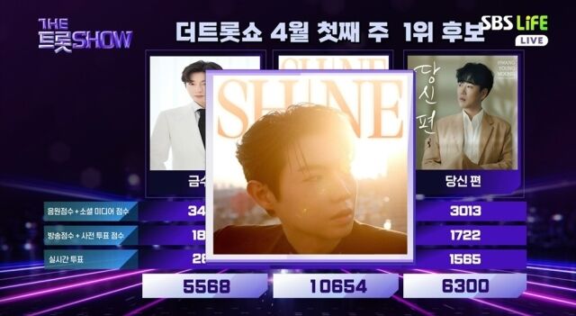 '더트롯쇼'/SBSLife[마이데일리=박로사기자]가수손태진이‘더트롯쇼’1위를차지했다.지난7일방송된SBSLife‘더트롯쇼’에서는손태진‘널부르리’,김용빈‘금수저’,황영웅‘당신편’이1위후보로오른가운데,손태진이총10654점을받으며2주연속1위를차지했다.이어2위는6300점의황영웅‘당신편’이,3위는5568점의김용빈‘금수저’가차지했다.'더트롯쇼'의차트곡및차트후보곡은2022년1월1일이후발매된트롯장르곡중선정된다.선정된100곡의후보곡에대한사전투표는생방송1주전4일간진행되며,실시간투표는생방송당일저녁8시5분부터9시까지진행된다.최종1위곡은음원점수,소셜미디어점수,방송점수,투표점수를합산한사전투표점수에실시간생방송투표를합산해선정된다.3주연속1위를할경우명예의전당에입성할수있다.'더트롯쇼'/SBSLife이날방송말미에는출연진전원이무대에올라트로트계의거장윤수일의‘아파트’를함께열창하며분위기를뜨겁게달궜다.선후배가수들이한데어우러져선보인무대는트로트에대한깊은애정을보여주며짙은여운을남겼다.이외에도강문경,고영태,고정우,김용필,김태연,박성온,서주경,신승태,양지은,염유리,오유진,윤수일,이도진,최수호,한가빈,홍자,황윤성이출연해다채로운무대를꾸몄다.‘더트롯쇼’는매주월요일오후8시SBSLife,SBSM에서동시생방송된다.Copyright©마이데일리.무단전재및재배포금지.