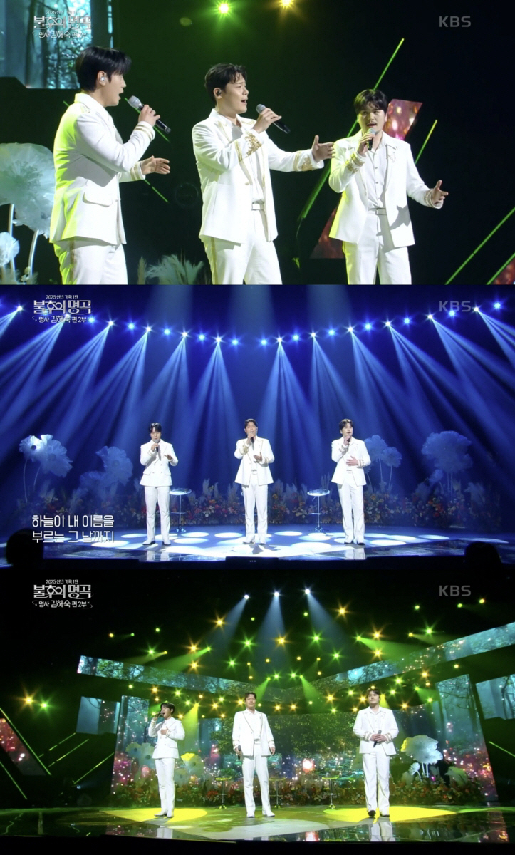 '불후의명곡'방송화면캡처[스포츠조선정빛기자]크로스오버그룹라포엠(LAPOEM)이하모니가돋보이는완벽한무대로안방을물들였다.라포엠유채훈,최성훈,정민성은지난18일방송된KBS2TV'불후의명곡'의명사김해숙편2부에출연했다.이날멤버박기훈이컨디션문제로휴식중이라고밝힌유채훈,최성훈,정민성은"셋이무대에오르는건처음"이라며"세명이서열심히노래해보겠다"며어느때보다다부진각오를다졌다.수와진의'파초'를선곡한라포엠은"엄마의입장에서자식들에게들려주고싶은이야기인것같아서잘풀어보려고한다.많은분들이따뜻함을느꼈으면좋겠다"고귀띔해기대감을높였다.본격적으로무대에오른라포엠은각기다른매력적인보이스로도입부부터관객들을사로잡은것은물론,완벽한무반주아카펠라를선보이며고품격무대를완성했다.특히곡이전개될수록터져나오는폭발적인성량과무대를풍성하게채우는라포엠만의천상의하모니가매순간감탄을이끌어냈다.라포엠의무대를지켜보던관객들은하나둘눈물을흘렸고,무대가끝나자마자기립박수가터졌다.라포엠의무대에푹빠진듯한모습으로곡을감상하던김해숙은"제가사실라포엠을되게좋아한다.'파초'를불러주신다고해서가슴떨리면서들었다.정말감동을주셨다"고무대에대한칭찬을아끼지않았다.이날라포엠은3연승을거두는저력을발휘하며,3인조로강렬한존재감을각인시켰다.지난2020년방송된JTBC'팬텀싱어3'의우승자라포엠은다양한분야에서두각을나타내며활발한음악활동을펼치고있다.정빛기자[email protected]©스포츠조선.무단전재및재배포금지.