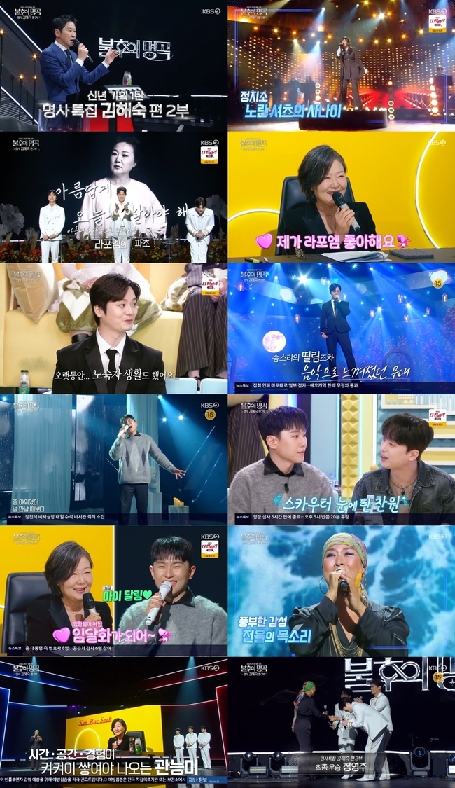 [뉴스엔박아름기자]정영주가3연승의라포엠을꺾고'불후의명곡'우승을차지했다.지난1월18일방송된KBS2TV'불후의명곡'689회는‘2025신년기획1탄:명사특집김해숙편’2부로정지소,라포엠,황가람,임한별,정영주가무대를펼쳤다.첫공에정지소의이름이뽑혔다.정지소는드라마‘수상한그녀’를통해김해숙과함께부른바있는한명숙의‘노란셔츠의사나이’를선곡했다.정지소는살랑살랑바람이부는듯한도입부에이어강력한목소리를선보이며기승전결이살아있는흐름이완성도를높였다.수준급가창력과무대매너를선보이며가수라해도손색없는무대를꾸며냈다.김해숙은정지소의반전가창력에놀라움을표했다.김해숙은“함께연기하면서지소의노래를들어보고사실정말놀랐다.그런데오늘은기절할뻔했다.어쩜저렇게잘하는지나중에조용히한번얘기좀해보자”며놀라워했다.정지소의뒤를이어라포엠이수와진‘파초’로두번째무대에올랐다.라포엠은휴식기에들어간박기훈의부재가느껴지지않을만큼꽉찬3중창무대를선보였다.라포엠은아카펠라로하모니를펼쳐내황홀경을자아냈다.라포엠의목소리에김해숙의연기와명대사가스크린에떠오르며시너지를냈다.‘아름답게오늘을살아야해’라는대사가무대와어우러져감동을줬다.“라포엠을되게좋아한다”며수줍게웃은김해숙은“'파초'를누가불러주시려나기대했는데가슴떨리면서들었다.역시큰감동을주셨다”며기뻐했다.이어김해숙은“지소야미안해”라고덧붙여웃음을자아냈다.라포엠이정지소보다많은득표로승자의자리에앉았다.‘불후의명곡’을꿈의무대로꼽은황가람이세번째무대를밟고양희은‘사랑그쓸쓸함에대하여’를불렀다.황가람은특유의거칠고외로운목소리로노래의화자가됐다.본연의매력을가득담아꾸밈없이펼쳐낸무대에많은이들이공감하며눈물지었다.황가람의우여곡절이보컬에그대로묻어나곡의매력을배가시켰다.황가람무대에대해김해숙은“굉장한자기자신과의싸움을많이하셨던분아닌가.그래서이자리에서계신거같다그게노래에서느껴졌다.앞으로정말기대많이하고응원하겠다.좋은일이많으실거같다”고덕담을전했다.라포엠이황가람을2표차이로따돌리고1승을추가했다.임한별이네번째바통을받아토이의‘여전히아름다운지’를김해숙에게헌정했다.‘여전히아름다운지’는김해숙이드라마속에서직접키보드연주를한곡.임한별은내내고음의향연을펼쳐내며듣는이들의감탄을자아냈다.계단식으로쌓아올리는고음보컬에모두가박수를보냈다.임한별은‘해숙누님’에게노래를바친다고한만큼,로맨틱한감성을담아냈다.김해숙은임한별을향해“부르시는동안행복하고황홀했다.제가드라마에서피아노쳤던기억에밑에서한번쳐보게되더라.그때행복했던순간을떠올리게하는멋진곡불러주셔서감사하다”며미소지었다.라포엠이파죽지세로임한별을꺾고또한번1승을더하며3연승의주인공이됐다.정영주가김해숙애창곡인임희숙‘내하나의사람은가고’로마지막순서를채웠다.정영주는김해숙을향한존경의마음을듬뿍담아무대에올랐다.정영주가경쟁자로꼽은라포엠과성사된맞대결.정영주는배우의장점을살려노래에진한감성을덧입혔다.출중한가창력위에연기적감성이쌓이며몰입도를최상으로끌어올렸다.보컬과감성의힘있는밸런스가돋보였다.김해숙은정영주에대해“가슴깊이폐부를찌르는듯한저런힘과멋진목소리를가지고제가소름이끼칠정도였다.자주노래를불러주셨으면좋겠다”고바랐다.치열한대결끝에정영주가2부트로피의주인공자리를차지했다.정영주는김해숙이직접선사하는트로피를품에안고함박웃음을지었다.김해숙은이번특집을마무리하면서“이자리에있는게아직도실감이안난다.저를사랑해주시고아껴주시는후배들제가좋아하는가수분들의노래와함께새해를맞이하게되어서정말기쁘다.올한해항상건강하시고좋은일만가득하길바란다”고말했다.이번특집은주인공인김해숙에대한남다른존경과애정이넘치는출연진들로라인업이구성돼어느때보다따뜻하고진솔한분위기가넘쳤다.김해숙과함께연기호흡을맞추고있는정지소를비롯해김해숙이팬을자처한라포엠,김해숙을평생의롤모델로꼽은정영주등의스토리텔링이풍성해감동이컸다는평이다.한편시청률조사회사닐슨코리아에따르면이날방송은전국6.3%로동시간시청률1위를기록했다.이에'불후의명곡'은무려102주정상을지키며적수없는1위를이어가고있다.뉴스엔박아름jamie@기사제보및보도자료[email protected]ⓒ뉴스엔.무단전재&재배포금지Copyright©뉴스엔.무단전재및재배포금지.
