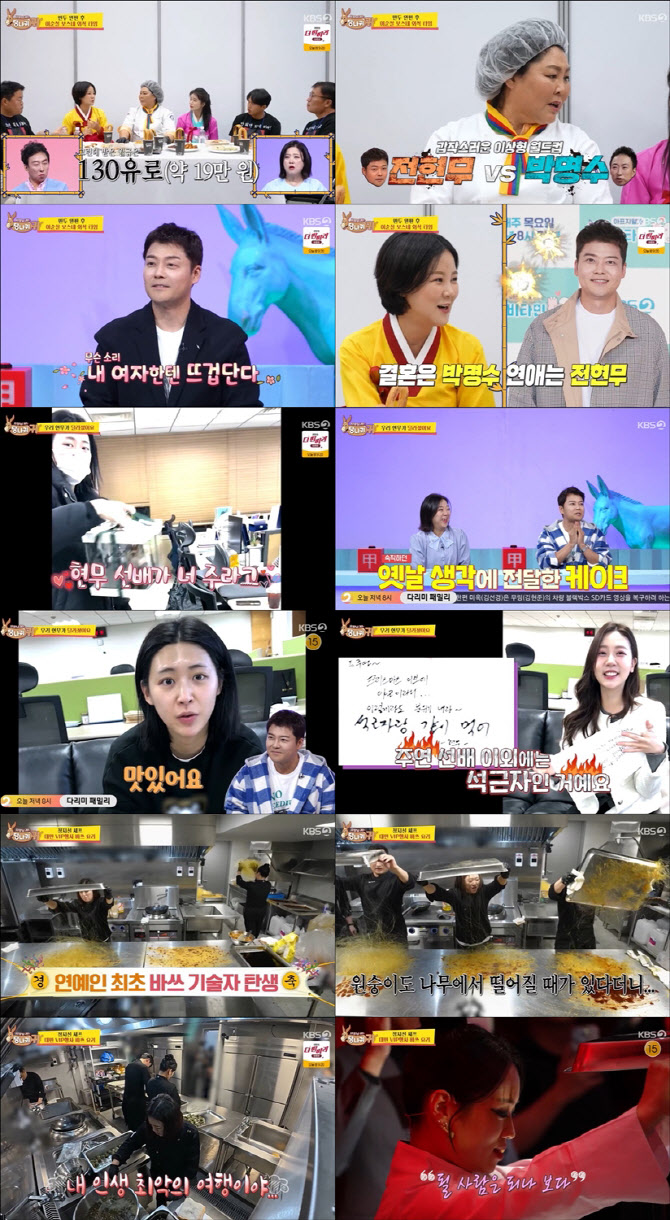 [이데일리스타in김가영기자]KBS2‘사장님귀는당나귀귀’전현무의특명을받은엄지인보스가지난해크리스마스이브에당직근무중인홍주연아나운서에게케이크를전달하는증거영상이공개돼화제다.지난19일방송된KBS2예능‘사장님귀는당나귀귀’(연출안상은,이하‘사당귀’)289회는전국시청률5.3%,최고시청률8.5%를기록했다.(닐슨코리아기준)후배김소연,나민희와‘이순실의이북요리쑈’를시작한이순실보스는메인메뉴‘오징어순대’제조에아낌없이재료를쏟았고완성된오징어순대를시식한관객들이구매에나서이순실을웃게만들었다.완판에성공한이순실은서로의탈북과정에대해이야기를이어가눈길을끌었다.특히“남한의명절이되면갈데가없다”며가족을그리워하는김소연에게“우리집에오라”는따뜻한말로감동을안겼다.유럽에서외화벌이를했던나민희는탈북을결심하게된계기에대해“외국사람들은쉬엄쉬엄일해도2,000유로를벌지만탈북민은고작130유로를벌었다.그때나는사람처럼살았던게아니었구나”라는말로안타까움을자아냈다.이어전현무,박명수중에이상형을묻는질문에이순실,김소연,나민희모두“박명수가낫다”고이구동성으로외치며“전현무는여자에게차가울것같고,이목구비가진한사람은북한에서인기없다.연애는전현무,결혼은박명수”라고설명했다.엄지인보스는크리스마스이브에있었던뜻밖의사건에대해증언했다.전현무가당직을하는홍주연에게크리스마스케이크와손글씨편지를선물한것.이에김숙,박명수,이순실이일제히흥분에빠진다.전현무는편지에‘크리스마스이브에당직이라니.이렇게라도분위기내길’이라며애틋한마음을드러내더욱뜨겁게달아오른다.박명수는전현무에게“당직인지어떻게안거냐?”,“집에서도보고여기서보니깐어떠냐”라며둘의로맨스를급격히응원해웃음을자아냈다.이어엄지인보스는여자프로배구캐스터와리포터오디션중간점검을위해5인의아나즈홍주연,남현종,김진웅,허유원,정은혜를소집했다.엄지인과함께후배들의멘토로나선KBS배구중계메인캐스터이재후아나운서가등장하자남현종은“이재후선배님이항저우아시안게임당시배구중계공부하시는것을보고흥미가생겨서지원했다”며존경을표했다.홍주연은이재후의배구룰기습질문에도막힘없이술술답해시선을사로잡았다.전현무는“김진웅이제일안어울리고남현종이제일잘할텐데이미메인종목을두개나하고있어서홍주연이잘할것같다”며응원하자김숙은“당당히좋아한다고(고백)해라”고부추겨폭소를안겼다.오디션당일,남현종은함께연습한홍주연을“포텐이있다.흡수가빠른편”이라며칭찬을했고,혼자큰소리로연습을하던김진웅이이재후와함께등장한한유미해설위원에게“누나”라부르며친분을과시하자이재후는“함께오디션을보는지원자들에대한배려없이가벼워보인다”고지적해오디션이결과가어떻게될지궁금증을자아냈다.리포터오디션이시작됐다.그러나정은혜가인터뷰에서말을버벅여아쉬운평가를받은반면허유원은배구팬컬러를활용한임팩트있는오프닝멘트로시작부터심사위원들의이목을집중시켰다.주어진미션까지완벽히녹인인터뷰에이재후는“KBS가새롭지않은느낌이있었지만지금처럼더현장감있게리포팅을한다면금상첨화일것”이라며만족감을드러냈다.대만VIP파인다이닝행사에한국대표로참여한정지선보스가‘시래기바쓰흑초강정’140인분조리를도와줄히든카드로김숙을초대했다.정지선은“김숙언니가의외로손도빠르고요리도잘한다.보조역할을톡톡히할것”이라며기대를드러냈다.정지선의칭찬을들으며바쓰제조를해내던김숙은“벌서는느낌이다”라며갸웃거리면서도쉬지않았고오히려정지선이쟁반을떨어트리는실수를연발웃음을선사했다.김숙은“내인생최악의여행이다.카메라꺼봐때릴거야”라며“내가진짜고소할거야”라고으름장을놓은가운데행사시작이임박했다.하지만열심히만든바쓰일부가녹아달라붙은상태임을확인한정지선은곧바로다시바쓰제조에돌입했다.숨가쁘게요리를완성한정지선이행사장무대위에등장하자현지인들이폭발적인반응을보내며환영했고,인터뷰후VIP들앞에서바쓰제조시범을시작했다.굳어버린설탕시럽때문에진땀을흘리는것도잠시,운명은정지선의편이었다.이내설탕비가쏟아지며VIP들의박수를받은정지선은“될사람은되나보다”라며‘대만바쓰의여왕’으로거듭났다.‘사장님귀는당나귀귀’는매주일요일오후4시40분KBS2에서방송된다.김가영([email protected])Copyright©이데일리.무단전재및재배포금지.