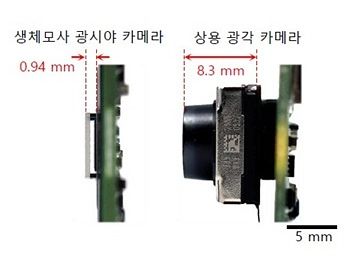KAIST연구팀이개발한카메라(왼쪽)와기존광각카메라.[사진KAIST]한국과학기술원(KAIST)연구진이스마트폰후면카메라가툭튀어나오는이른바‘카툭튀’문제를해결할초박형구조의카메라기술을최초로개발했다.주로말벌에기생하는제노스페키라는곤충의눈에서그해법을찾았다.KAIST는바이오및뇌공학과정기훈교수와전산학부김민혁교수공동연구팀이곤충의시각구조를이용해아주얇으면서도화각이넓은고화질의‘광시야생체모사카메라’를개발했다고7일밝혔다.연구팀은머리카락굵기와비슷한두께1㎜이하카메라로사람시야를뛰어넘는140도의대각시야각(화면의대각선을기준으로측정된시야범위)을확보하는데성공했다.이번연구결과는국제학술지네이처커뮤니케이션즈에지난달23일게재됐다.카메라성능을개선할수록후면카메라가더돌출되는건최신형스마트폰디자인의고질적인딜레마였다.고성능광각카메라일수록여러렌즈를겹쳐써야하기때문에이런문제가생긴다.일부소비자들은이‘카툭튀’디자인으로스마트폰을바닥에놓았을때수평이맞지않아불편함을호소한다.또세련된디자인의옥에티로꼽히기도했다.연구팀은기생곤충인제노스페키의시각구조에서해법을찾았다.제노스페키는여러개의눈이한장면을부분이미지로나눠인식한뒤이를뇌에서하나의이미지로결합하는독특한시각구조를가지고있다.연구팀은이제노스페키의시각구조에착안해분할촬영후통합하는원리를카메라에도입했다.여러개작은렌즈를통해각각다른방향을동시에촬영한뒤이를하나의화면으로합치는방식으로,두께가얇으면서도고화질로촬영할수있는신개념카메라를만들었다.특히두께가1㎜도안되는카메라가140도광각을구현한건‘두께가얇으면시야가좁다’는광학적상식을깨뜨렸다는평가가나온다.연구팀이개발한카메라는스마트폰후면은물론매우작고좁은공간에서정밀한촬영이필요한다양한분야에적용될수있다.의료용내시경과미세로봇,웨어러블헬스케어장비등이대표적이다.연구팀은이기술을광학영상전문기업인마이크로픽스에이전해내년까지상용화할계획이다.정기훈교수는“자연계의시각원리를적용해초소형구조에서도넓은시야와안정적인영상품질을동시에확보할수있게됐다”고말했다.강광우기자Copyright©중앙일보.무단전재및재배포금지.