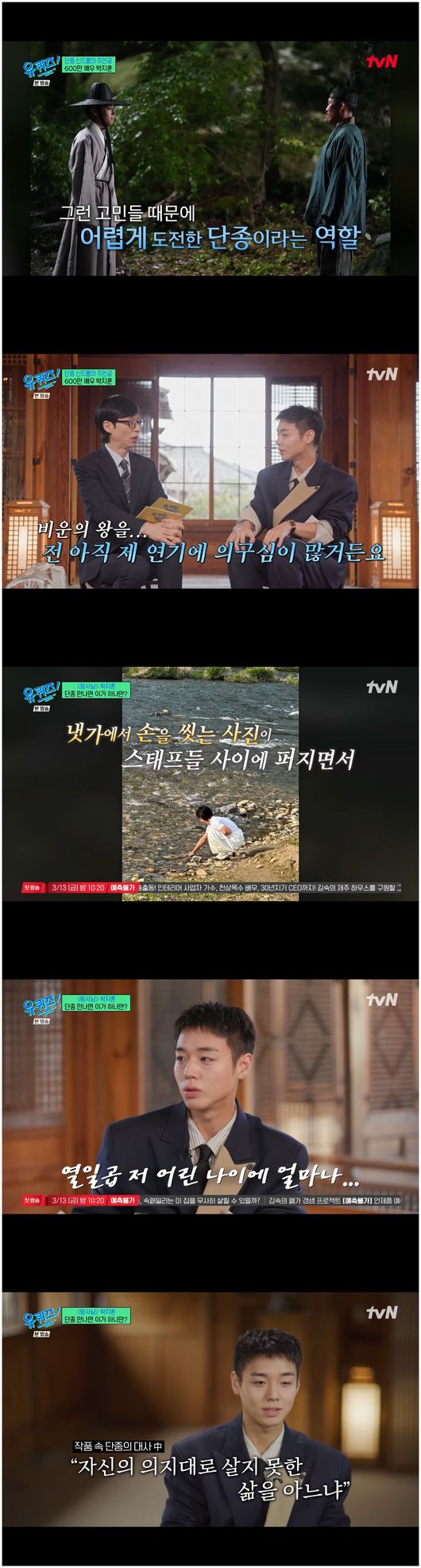 <리뷰:방송시청후작성된리뷰기사입니다.>[OSEN=오세진기자]‘유퀴즈온더블럭’영화'왕과사는남자'에서단종이홍위역을맡은박지훈이단종의마음을헤아리며대답했다.25일방영된tvN‘유퀴즈온더블럭’(이하‘유퀴즈’)에서는영화'왕과사는남자'로또한번신드롬을그리는'내마음속의저장'의시작이자배우박지훈이등장했다.유재석은“윙크보이에서단종으로!말간얼굴에처연한눈빛,관객들의단종이된박지훈씨다”라며박지훈을소개했다.박지훈은'왕과사는남자'에서단종이홍위역할을맡았다.파죽지세로관객수를갱신중인'왕과사는남자'(이하'왕사남')은계유정난후영월유배지에서죽기까지의단종의이야기를그린픽션영화다.박지훈은처음자신의연기력에대해의심이들어배역을고사했다고밝혔다.그러나단종역을위해두달동안15kg을원푸드다이어트로감량했고,또한자신만의연기디테일을곁들였다.박지훈은“저만사실갖고가려는단종의디테일이있다.외적인변화도있지만,힘빠진목소리였다가홍위가변하면서본래의목소리로돌아가는걸로톤을조절하려고했다”라고말했다.그러면서그는“단종께서꿈에나타나시면넙죽엎드려서여쭙고싶다.영화를보셨냐고,저를보고환하게웃어주시면,어떤칭찬보다정말행복할거같다”라며간절하게소망했다.특히영화속명장면으로꼽히는'단종의물놀이'장면에대해서도박지훈은연민과애정을담아이야기했다.유재석이“본인이느낀단종의일생은어떠냐”라고묻자박지훈은“왕이기전에어린나이의소년아니냐.그런장면이딱하나있다.원래는제가준비중에냇가에서손을씼었는데,그걸스태프분께서찍어서올렸다.그걸보고유해진선배님께서이것도담자고했다”라며대답했다.이런박지훈에게과몰입하는배우도있었다.바로영화속특별출연인'금성대군'역의이준혁이었다.이준혁은“현실에서못보고그래서애틋한마음이크다.정말단종이환생한거같다”라며조심스럽고애틋한눈빛으로박지훈을보았다.박지훈에게이런사랑받는면모를알려준건아마도할머니가아닐까.아역배우로데뷔해중학생때는춤에빠졌던박지훈은19살나이로'프로듀스101'을통해워너원으로데뷔했다.박지훈은“101명다같이첫무대를하는데해도나를안잡아주는거같았다.사실나가는목표자체는우리를알리자,이건데나가니까그런마음이사라지데요?기왕나간거면해보고싶었다”라고말했다.계약종료후가수박지훈이자배우박지훈으로차곡차곡필모를쌓던그는할머니에대한그리움을뽐냈다.그는첫영화에서'알츠하이머를앓는엄마'를대하는자신에대해“영화에서엄마가알츠하이머에걸렸다.할머니가치매셨다.그래서그런마음으로찍었다”라고말했다.그러나박지훈은“할머니가나에게는주인공인데,영화시사회다음날돌아가셨다”라면서“저오면용돈주실거라고,5만원쥐고주무셨다.저갈때까지쥐고계셨다더라.할머니께‘저용돈주세요’라고하는데저라는걸기억을못하셔서안주시더라.저를기억못하신게너무마음이아팠다”라고말했다.이어박지훈은눈물이차오른탓인지헛기침을크게하더니“할머니돌아가시고,꿈에서할머니께서절보고환하게웃어주셨다.바로산소로달려가서한참앉아있었다”라며그때를회상했다./[email protected][사진채널]tvN채널‘유퀴즈온더블럭’방송화면캡처Copyright©OSEN.무단전재및재배포금지.