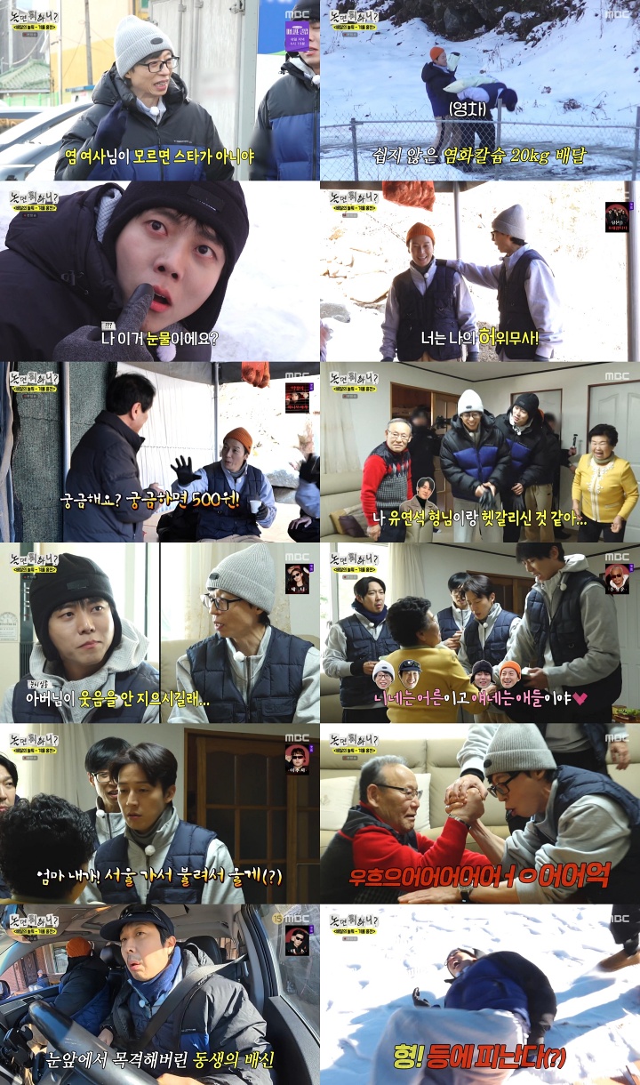 "나의'허위무사'다.빌허(虛)"iMBC연예뉴스사진'놀면뭐하니?'허경환,주우재가인지도도,명예도잃으며(?)혹독한겨울의홍천을맛봤다.1월31일방송된MBC예능프로그램'놀면뭐하니?'(연출김진용이주원안지선방성수박은진/작가노민선)는강원도홍천산골마을로혹한기배달을떠난유재석,하하,허경환,주우재의'배달의놀뭐-겨울홍천'편으로꾸며졌다.이날방송의수도권가구시청률은4.5%를기록했다.미디어소비환경변화를반영한채널경쟁력핵심지표2054시청률은2.5%를기록하며토요일예능1위행진을이어갔다.최고의1분은하얀눈밭에서동심으로돌아간멤버들이피나는(?)눈썰매를타는장면으로,분당최고시청률이5.8%까지치솟았다.(닐슨코리아수도권기준)영하17도강추위속네사람은읍내로나오기힘든주민들을위해필요물품과염화칼슘배달을시작했다.첫배달부터위기였다.도로가얼어20kg무거운염화칼슘을직접짊어지고오르막길을가야했던것.혼자뒤처진주우재는바닥에퍼질러진채"힘든사람처음봐요?"라고말하며눈물을흘려웃음을자아냈다.허경환은대벌레처럼쓰러진주우재를지나쳐유재석을따라갔고,유재석은"경환이는나의'허위무사'다.빌허(虛)"라고임명했다.이어'홍천의스타'염희한여사와'홍천의양관식'김정태아버님의집을방문했다.유재석과하하는고향집오듯익숙하게들어선반면,첫방문인허경환과주우재는인지도굴욕을맛봤다.염희한여사는주우재를유재석과다른프로그램을함께한배우유연석으로착각한채반가워했다.허경환은유행어메들리로자신을어필했지만김정태아버님은모르는눈치였고,유재석은"어르신이너잘모른대"라고놀렸다.그와중에염희한여사는구면인스태프들을챙겼고,스태프얼굴은알지만출연자는모르는상황이연출돼웃음을자아냈다.김정태아버님과의팔씨름대결도펼쳐졌다.내내과묵하던아버님은팔씨름이야기가나오자처음으로미소를보였고,네사람중가장겨뤄볼만한상대로허경환을지목했다.'종이인간'주우재보다도최약체로선택된허경환은인지도도명예도한꺼번에잃으며웃음을자아냈다.그와중에주우재는아버님을상대로눈치없이힘을쓰다제지를당했고,참교육에나선유재석이호들갑을떨며아버님의무패행진을끝까지지켜냈다.이어네사람은식사를하러마을회관에갔다가,빠뜨리고온밥솥을가지러염희한여사의집으로돌아갔다.유재석은'홍천신입'허경환,주우재에게"너네들이집에들어가면도둑(?)이야.가족사진에있는사람만들어갈수있어"라면서홀로밥솥을가지러갔다.그사이하하는유재석만두고도망칠작전을세웠지만,실행도전에발각됐다.주우재는빠르게태세전환을하며하하를배신했고,허경환은입을굳게다문채침묵으로일관하는처세술을보였다.식사후네사람은천연눈썰매장에서겨울의홍천을만끽했다.네사람은돌부리에꼬리뼈를강타당한채곡소리를내면서도눈썰매를즐겼다.그가운데주우재는썰매를타다가찢어진장갑을보여주며칭얼거렸다."그래보이니까그만해이제"라며주우재를외면했던허경환은유재석이"이거봐라!"라고부르자'허위무사'가되어호다닥달려갔다.제작진까지카메라를들고유재석에게몰려든사이,돌부리보다도주목받지못한채홀로남겨진주우재의모습이웃음을자아냈다.한편,다음방송예고편에는흑백요리탈출전쟁을벌이는멤버들의모습이담겨과연어떤상황일지궁금증을증폭시켰다.MBC'놀면뭐하니?'는매주토요일오후6시30분방송된다.iMBC연예백아영|사진출처MBCCopyright©MBC연예.무단전재및재배포,AI학습금지.