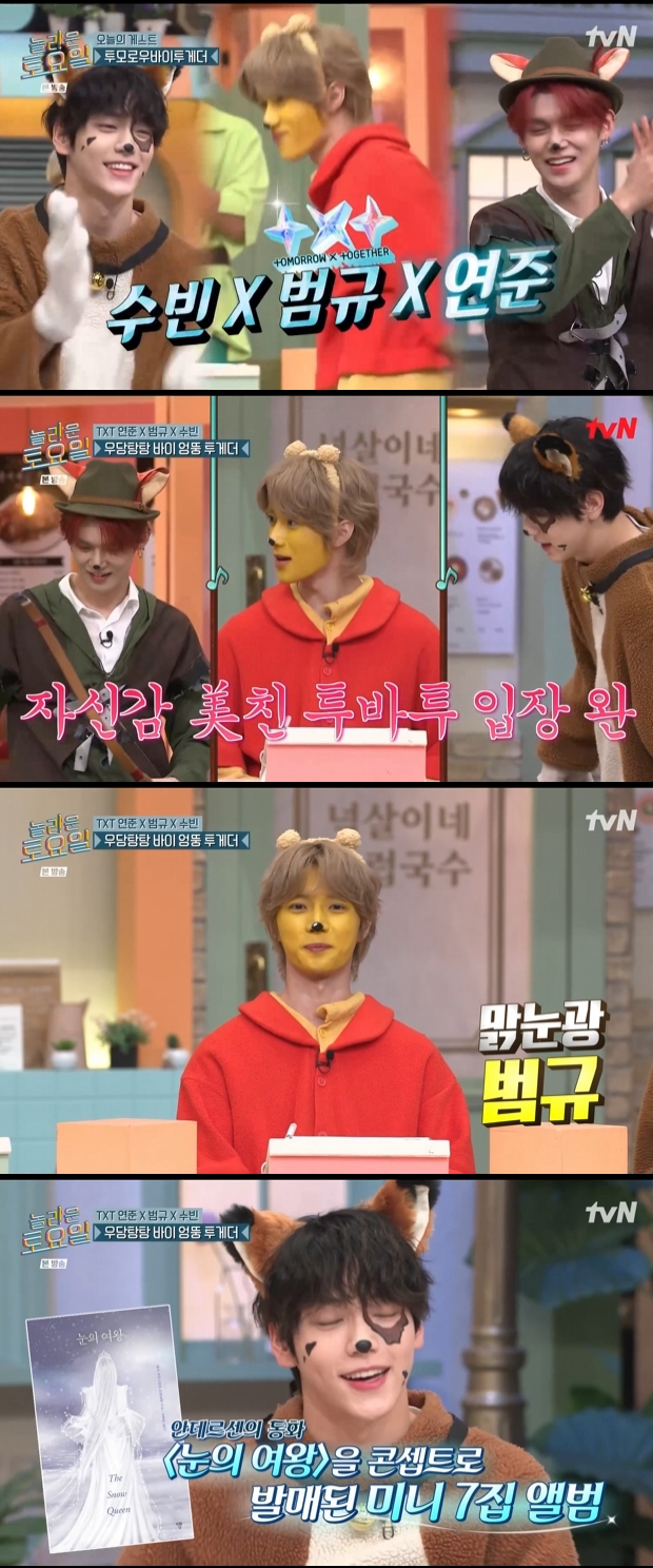 놀라운토요일[티브이데일리김종은기자]'놀라운토요일'투바투범규의분장이키마저당황케했다.16일저녁방송된tvN예능프로그램'놀라운토요일'에서는투모로우바이투게더연준,수빈,범규가출연해가사맞히기에도전했다.이날연준,수빈,범규는눈을사로잡는분장으로스튜디오에등장해시선을끌었다.세사람은각각로빈후드,파트라슈,곰돌이푸로변신했고특히범규는얼굴을통째로노란색으로칠해모두를폭소케했다.이를본신동엽은"분장을세게하니까자신감들이넘친다"라고,키는"이렇게까지할필요는없지않냐"라고웃음을터트리기도.이어본격적으로인터뷰시간이진행됐다.먼저연준은컴백근황을전한뒤지난번출연당시인상깊었던멤버가누구냐는물음에"지난번출연당시동현님이제마음속에쏙들어오셨다.그때사오정같은모멘트가인상깊었다"라고답했고,범규는키를꼽으며"제가하는말이묻힐수있는데그때마다리액션을해주시며돋보이게해줬다.구세주같았다"라며애정을드러냈다.[티브이데일리김종은기자[email protected]/사진=tvN'놀라운토요일']놀라운토요일[Copyrightⓒ*세계속에新한류를*연예전문온라인미디어티브이데일리(www.tvdaily.co.kr)/무단전재및재배포금지]Copyright©티브이데일리.무단전재및재배포금지.