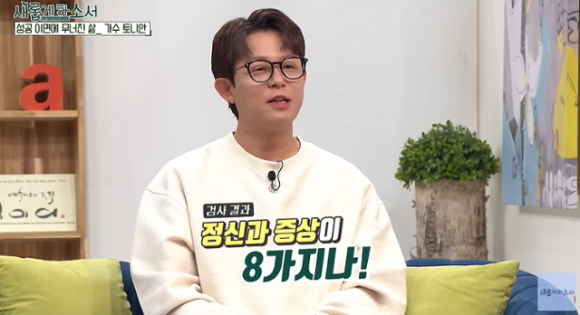 H.O.T.출신토니안,성공이후찾아온아픔술과약함께복용하며위험한일겪기도토니안이과거의아픈기억을떠올렸다.'새롭게하소서'캡처H.O.T.출신토니안이과거우울증과대인기피증등에시달렸던일을고백했다.13일공개된유튜브채널'새롭게하소서'에출연한토니안은H.O.T.로데뷔하게된비하인드부터사업가로변신하게된일화를털어놨다.그는그룹생활을하는내내자존감이부족했다며,재능이없는데좋은멤버들과회사를만나성공한것같다는생각을많이했다고밝혔다.해체이후두려움이컸던토니안은"열등감과강박에시달렸다.그런데내가말을좀잘하는편이다.그래서'내가잘할수있는걸보여줘야겠다'는생각에사업을시작하게됐다"고전했다.그는"사업이성공해상상을초월하는돈을벌게됐고,모든게다완벽했다.'난이제인정을받겠구나'생각했는데그때부터삶이무너지기시작했다"며"외로웠던거같다.힘들다는이야기를못하겠더라.그러면서주변사람들이멀어지더라"라고회상했다.친구들에게힘들단이야기도못하며멀어지게된토니안은스스로울타리를치고고립된생활을했다.또한토니안은"어느순간두통이오더라.너무고통스러웠다.두통약을하루에8알씩먹었다.그런데도두통이안사라지더라"며지인의추천으로처음정신과를찾았다고털어놨다.당시검사결과,정신과증상이8가지나타났다는그는"우울증,조울증,대인기피증등이나왔다.약을많이처방받고약을먹은후두통은사라졌다.그런데사람이되게무력해졌다"며부작용을밝혔다.토니안이과거의아픔을고백했다.'새롭게하소서'캡처토니안은과거를떠올리며"모든걸내스스로이겨낼수있단착각을한거같다.승승장구하다보니오만해진거같다.아무것도하기싫었다.돈도귀찮고먹는것도귀찮고그냥삶이귀찮았다.하루하루멍하게시간을보냈다.일은했지만,멍하게시간을보내다보면사람이좋은생각이안든다.계속나쁜생각이들었다.'이삶이무슨의미가있나'라고생각이들었다"고말했다.그러면서"높은층에살았는데매일베란다에나가서밑을보며(나쁜)상상도많이했다.그와중에도추하게죽으면안된다는생각이들다보니까그런걸연구하게되더라.'어떻게하면멋있게죽지'하고그런분들의과거도찾아봤다.정말사는게아니었다"고고백했다.하지만겁이많아서실제시도는한적없다고.그러던중술과약을함께먹다가참사가일어났다고밝힌토니안은"눈을떴는데침대더라.베개와이불이축축하더라.침대가피로흥건했다.기억은전혀없었다.거실로나가다가거울을봤는데머리가빡빡이인거다.머리가길었었는데거실에보니머리카락들이있더라.가위로머리를자르다가실수로귀를베면서피가났던거다.천만다행인건조금만잘못잘랐으면과다출혈로죽을수도있었다"고전해충격을안겼다.이어"그런상황에서관리실에서연락이왔다.왜그러는지묻자,엘리베이터를타고올라오는길에거울을머리로깼다는거다.다음날관리아저씨가CCTV를돌려보고혹시다치지않았는지물은거다"라고덧붙여모두를놀라게했다.유수경기자[email protected]©한국일보.무단전재및재배포금지.