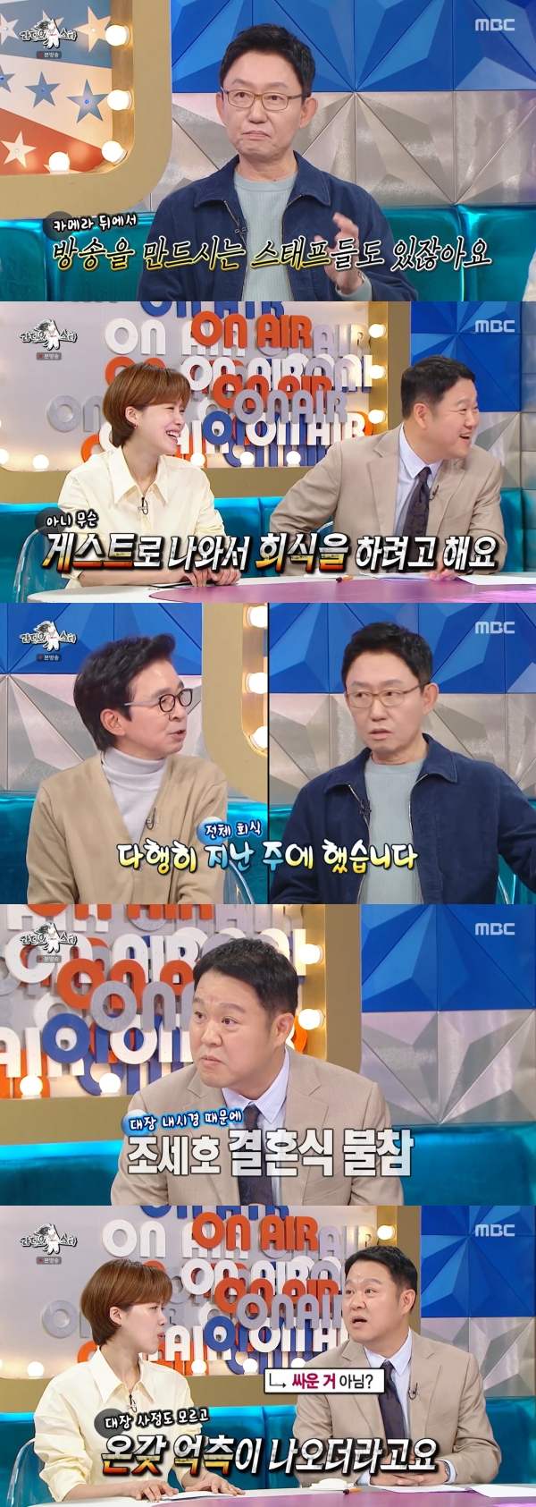 사진=MBC[스포츠투데이김태형기자]김구라가조세호결혼식에못간이유를공개했다.13일방송된MBC'라디오스타'에는'투머치가온다'특집으로손범수,한상보,뉴진스님(윤성호),미미미누가출연했다.이날3년만에'라디오스타'에출연한손범수는"저는가장중요하게생각하는것이어울림이다"라며회식의중요성을강조했다.이에김구라는"아니무슨게스트로나와서회식을하려고하냐"고반응했다.유세윤은"저희는거의1년에한두번할까말까한다"고밝혔다.김국진은"다행히지난주에했다"고선을그었다.김구라도"MC들이일단술을별로안좋아한다.밥은집에가서먹으면된다"고철벽을쳤다.이에손범수는"저랑이념이다르다"며"그래서구실을마련했다.오늘회식안하려고한이유가제가내일건강검진이다.갈수가없다.대장내시경을받아야한다"고말했다.그말을들은김구라는"제가대장내시경때문에조세호결혼식을못갔다.그랬더니온갖억측이나오더라.제가남의결혼식에가서계속화장실을갈수없지않냐"고밝혔다.[스포츠투데이김태형기자[email protected]]Copyright©스포츠투데이.무단전재및재배포금지.