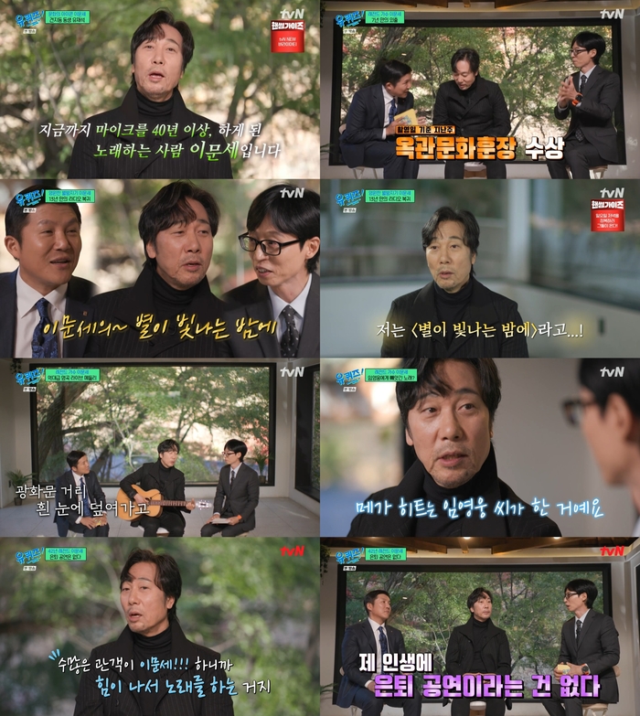 원조‘별밤지기’이자음악인가수이문세가자신의음악인생과더불어음악적인소신을전했다.13일방송된tvN예능프로그램‘유퀴즈온더블록’(‘유퀴즈’)에서‘영원한별밤지기’이자대중문화의아이콘이문세가등장해다양한이야기를들려주었다.1985년4월1일부터1996년12월2일까지,무려11년7개월간MBC표준FM‘별이빛나는밤에’(이하‘별밤’)의DJ‘별밤지기’로자리했던이문세의등장에유재석과조세호는“‘별밤지기’였던이문세형님의목소리를들으면서많은위안을받았다”고말했다.이에이문세는“‘별밤’을하면서인격형성도많이됐다.제자신이다듬어지고다듬어지도록한것이라디오라고생각한다”고별밤지기활도엥대한애정을드러냈다.13일방송된tvN예능프로그램‘유퀴즈온더블록’(‘유퀴즈’)에서‘영원한별밤지기’이자대중문화의아이콘이문세가등장해다양한이야기를들려주었다./사진=‘유퀴즈’캡처이문세는‘별밤’을하면서가장기억나는사연에대해“어느여고생이방송국으로매일매일편지를썼다.첫번째편지두번째편지세번째편지를보내면서‘백번째까지편지를쓰겠다’고했는데반쯤지날무렵편지가안오더라.그로부터수개월후에51번째편지가새로왔다.글씨체가달랐다.추적해서알아봤더니그친구가오십몇번째까지쓰다가불치의병으로세상을떠난것”이라며“그걸친구가소식을듣고(죽은)친구를대신해서쉰몇번째부터백번째까지채워졌다”고털어놓아뭉클함을안겼다.11년7개월끝에떠난‘별밤’에대해이문세.이와관련해이문세는“이문세에게있어서인생에서가장빼놓을수없는한지점에다시돌아간다면저는‘별이빛나는밤에’라고서슴없이말할수있다”고고백했다.DJ활동뿐아니라40여년동안수많은히트곡을발표했던이문세는신곡으로돌아온이유에대해“히트곡한곡을더만들기위해서하는건아니다.음악의리듬과그흐름을계속가지고가는것이음악하는사람의본능이자의무라고생각이든다.꾸준하게창작에욕심을내고있는것뿐”이라고설명했다.이후이문세의명품라이브공연이펼쳐졌다.‘소녀’‘옛사랑’등을열창한이문세는한국가요사최고의음악적파트너이자,페르소나로평가받고있는故이영훈작곡가에대해“예전에는저의파트너가있었다,이영훈씨.세상떠난지벌써16년이됐다.그유명한명곡들을다만들어주고떠났다.그러니까덩그러니저혼자남아서제가제노래를써야하는데,터무니없이역부족이다.소양도그렇고음악적감성도그렇고”라며“저를많이채워주고행운같은사람이라고생각한다”고그리워했다.13일방송된tvN예능프로그램‘유퀴즈온더블록’(‘유퀴즈’)에서‘영원한별밤지기’이자대중문화의아이콘이문세가등장해다양한이야기를들려주었다./사진=‘유퀴즈’캡처이문세는자신의곡인‘사랑은늘도망가’를부른임영웅에대해“이렇게메가히트는임영웅씨가한것”이라며“진짜오리지널은저인데,억울하지않고,오히려영웅씨덕분에제노래도재조명되고그래서가창자로서좋다”고말하기도.최근자신이가지고있는고민에대해서도털어놓았다.“저는지금60대”라고말문을연이문세는“모든것이느려진다.생각도느려지고행동도느려진다.그러다보니공연을한번기획해서하다보면슬로템포가저에게맞는거다.에너지가차올랐을때는아무것도아니었다.하루에3~4시간을자도‘새날이밝았다’했는데요즘은7,8시간을누워있어도왜이러지한다”며“빠른노래를하더라도눈물을흘리는관객의눈빛과마음을생각하면일어나자,또열심히연습하자,헬스클럽가서근육운동하고몸을만들자는동기부여가된다”고밝혔다.이어“공연에오시는분들은이문세의히트곡한곡을듣기위해서오시는게아니라자신의인생이한바퀴돌아가는경험을한다.삶의여정들이이문세노래한곡으로스쳐지나가고,‘어떻게살아왔고,그때는어떤꿈을꿨었던사람인데지금이렇게살고있구나’를느끼는거다.제가허투루준비할수없다”고소신을드러냈다.이문세는유재석의한결같음에대해서도극찬했다.유재석이“같이나이를먹고있지만저도연예계에데뷔를해서30년정도지났다”고하자,이문세는“연예오락프로그램을진행해왔던까마득한후배라고생각했는데,지금은너무존경스럽고존경한다.한결같다.대한민국에이런사람,전세계적으로도없을거라고생각한다.그건무슨힘이냐.자기취면이냐”고칭찬했다.이에유재석은”여러가지가있을수있다.자기최면일수있고에너지를내기위해평소에관리도하고,무엇이든체력이필요하다.체력을위해서운동도한다.나름의노력을저도한다”고답했다.유재석의말에조세호는“유재석형님이‘우리는일주일에와서한번녹화하지만,제작진은그하루를위해일주일내내밤을새우니까너는항상잘준비하고와야한다,그게우리가해야할일이다’고말한것이제일기억에남는다”고거들었다.13일방송된tvN예능프로그램‘유퀴즈온더블록’(‘유퀴즈’)에서‘영원한별밤지기’이자대중문화의아이콘이문세가등장해다양한이야기를들려주었다./사진=‘유퀴즈’캡처이문세는원조별밤지기로서20,30대에게해주고싶은이야기가있냐는유재석의질문에“제가20대때앞이보이지않을때가있었다.사람이살다보면앞이안보일때가있지않느냐.길