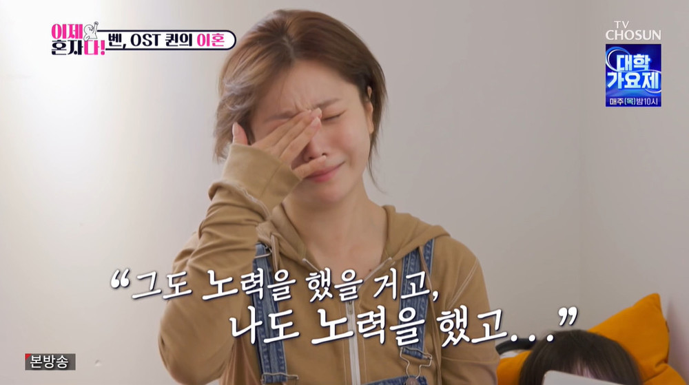 TV조선‘이제혼자다’캡처TV조선‘이제혼자다’캡처TV조선‘이제혼자다’캡처[뉴스엔장예솔기자]가수벤이이혼후심경을최초로고백했다.11월12일방송된TV조선'이제혼자다'에서는벤의일상이공개됐다.벤은지난2021년W재단이사장이욱과결혼해딸을품에안았다.그러나벤은결혼3년만인지난2월이혼소식을전했다.당시벤은남편의귀책사유로이혼을결심했다고밝힌바있다.양육권은벤이가지고있다.이날벤은전남편에대해"저는되게일찍결혼을하고싶어했던사람이다.'이런사람이랑결혼해야하는건가보다'라고생각했고,그마음이서로맞았다"고밝혔다.29살이른나이에결혼한벤은"처음1년은알콩달콩잘지내다가일들이하나둘씩생기고마찰이생기면서다툼이잦았다.엄청많은일들이있었다"고힘들었던과거를회상했다.벤은"내가되게쉬운사람이된것같은느낌이었다.이러려고사랑한게아닌데.'내가이렇게했으면너는나한테이렇게하면안됐지'라는생각을많이했다"고털어놨다.벤은"잦은다툼으로완전히지쳐있을때잠시모든걸내려놓고여행을갔다.그쉬는중에딸리아가생겼다.리아가저를살리러온느낌이었다.아기를가지면행복하려고노력하지않나.되게힘든시기에찾아와줬다"며딸을향한애정을드러냈다.그러나출산후6개월만에이혼을결심했다.벤은"사실진짜너무많은일들이있어서극복하려고엄청나게많은노력을했다.내인생에이혼은절대없을일이라고생각했다.제가자라온환경에서는가장하면안되는게거짓말이다.저또한그렇게커서그런지거짓말이정말싫었다"고전했다.전남편의거짓말로신뢰가무너졌다는벤은"아기를낳고나서는더이상결혼생활을유지하면안될것같았다.저는리아를낳은후에야용기가생겼다.그만해야겠다는생각밖에없었다.이아이를행복하게해줘야하는사람인데온전한가정안에서키울수없을것같다는생각이들어서결정했다"고덧붙였다.벤은이혼후삶을떠올리며"많이피폐했다.처음으로우울증이라는것도겪었다.저는14년동안연예계생활을하면서'나는진짜건강하고단단하구나'라고생각했는데그런제게도이혼은힘들었다.그냥완전다포기상태였다.제가결정을했는데생각보다쉽지않더라.그때는제가없었다.그냥죽었다.제가제자리로못돌아올줄알았다"고말해먹먹함을안겼다.리아와함께한신곡녹음이후벤은절친솔지를만났다.솔지는"이혼을결심한게언제쯤이냐"고물었다.벤은"작년8월말이다.너무사랑하는사람이었고,살다보면많은일들을겪으니까'안고가야지'란생각도있었다.사랑하는마음이면다버틸수있을줄알았다.언니한테'사람하나만들어봐야지'라고하지않았나.근데사람은안변하더라"고이야기했다."이혼은결코혼자할수있는일이아니다.그도노력을했을거고,나도노력을했다"고밝힌벤은눈물을쏟으면서"살아야하니까.계속그렇게피폐하게살고싶지않았다.또책임져야할아이가있으니까용기가생겼다.살고싶었고,행복하고싶었다.그래야아이도행복할것같았다"고털어놨다.벤은리아앞에서는차마말할수없는이야기를제작진에게터놓았다.벤은"전남편한테'어떻게내가리아낳은걸후회하게만들어'라고얘기한적있다.진짜후회가돼서한말은아니지만감정이북받쳤다.그건좀창피하다.아무리이사람한테비수를꽂고싶었어도하면안될이야기였다.그정도로힘들었다"고어렵게입을뗐다.리아와전남편은2주에한번씩만나고있었다.벤은"리아가아빠를엄청좋아한다.우리는아이가있으니까완전히헤어질수없다.이제는리아에관해선서로상의를하려는편이다.나는걱정했는데아빠한테반갑게뛰어가는모습을보면서처음으로리아에게너무미안했다.리아를위해서라면엄마,아빠와함께하는시간을주고싶다"고딸을향한애틋함을드러냈다.뉴스엔장예솔imyesol@기사제보및보도자료[email protected]ⓒ뉴스엔.무단전재&재배포금지Copyright©뉴스엔.무단전재및재배포금지.