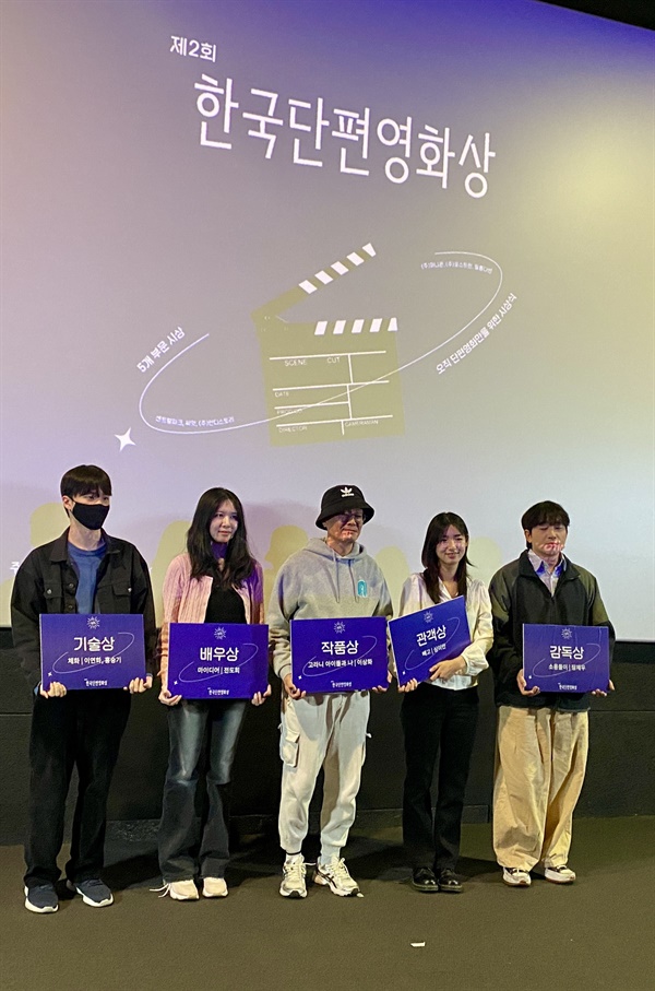[현장]2회한국단편영화상시상식열려...5개부문시상성하훈영화저널리스트이상화감독의애니메이션영화<고라니아이돌과나>가제2회한국단편영화상작품상을수상했다.감독상은장재우감독의<소용돌이>,배우상은<마이디어>에서공동연출로도참여한전도희배우,기술상은홍승기감독<체화>,관객상은심이안감독의<빼고>가각각선정됐다.10일저녁서울홍대'KT&G상상마당시네마'에서개최된시상식은단편영화격려의장이면서젊은한국영화미래감독배우를발굴한다는의미도있었다.국내외영화제를통해관객들에게한번씩은눈도장을찍은쟁쟁한단편영화들이몰린탓에참석자들은수상결과에촉각을곤두세우는모습이었다.매년한국영화아카데미와한국종합예술학교를비롯해주로대학영화전공학과를중심으로만들어지는단편영화는1500편이상이다.각대학의졸업작품전등에서소개된이후국내외영화제를통해관객과의접촉면을늘리고있다.이날수상작들역시다양한영화제에서검증을받은작품들이대부분이었다.작품상을받은<고라니아이돌과나>는올해부천국제판타스틱영화제,서울인디애니페스트상영작이었다.감독상<소용돌이>는올해전주국제영화제상영작으로서울예대재학중인감독이연출했다.배우상<마이디어>는2023년부산국제영화제에서선재상을수상했다.기술상수상작인<체화>역시올해원주옥상영화제와가치봄영화제등에서관객들과만났다.관객상수상작인<빼고>는한국종합예술학교졸업작품으로올해서울여성독립영화제관객상과광주여성영화제작품상을받은바있다."관객이오지않는시대에받는관객상뜻깊어"▲10일저녁서울홍대KT&G상상마당시네마에서열린2회한국단편영화상수상자들ⓒ성하훈수상자들은기쁨을감추지못했다.각각특색있는수상소감으로감사를전했다.첫수상자로발표된관객상<빼고>는이날막을내린광주여성영화제에서'귄작품상'을수상하며같은날두개의상을받는특별한영광을안았다.광주에있는감독을대신해수상자로나온조이영배우는"관객한분께서영화가엄마에게보내는러브레터같다고말씀해주셨다"라며"이번에한국단편영화상에서관객상을받으면서편지에대한답장을관객분들한테받은것같아서정말감사드리고영광으로생각한다"고인사했다.이어감독이보내온수상소감을읽었다.심이안감독은"극장에관객이예전에비해많이오지않는시대에관객상을받는것은더더욱감사하고뜻깊은일이라고생각한다"며"입시당시논술에서극장에서관객들끼리나누는몰입도를중요하게생각하는사람으로서관객들이함께소리를내며감정을공유할수있는영화관이조금은변형될지라도계속존재할것이라고했는데,<빼고>라는졸업작품을통해관객들의웃음소리,훌쩍거리는소리,기침소리를듣는경험은참으로소중했다"고인사했다.배우상을받은전도희배우는"올해개인적으로기쁜일도되게많았고슬픈일도되게많았기에오늘까지만힘들어하자오늘까지만슬퍼하자이렇게다짐했다"라며"이상도오늘까지만기뻐하자이렇게다짐할건데한동안은이삶이행복할것같다"라고인사했다.감독상을수상한<소용돌이>장재우감독은"누구나갑자기갑자기몰려오는소용돌이를맞을때가많은데다들소용돌이를너무무서워하지말고자기가선택한길을좀단단하게걷다보면언젠가소용돌이가끝나고모두에게거창한날이오지않을까싶다"며"다른분들도다들힘차게살았으면좋겠다"라고수상소감을밝혔다."어려울때일수록단편영화더지원해야"▲2회한국단편영화상축사하는백재호한국독립영화협회이사장ⓒ성하훈한국단편영화상은국내6개단편영화배급사가주축이된'한국단편영화배급사네트워크(센트럴파크,씨앗,㈜인디스토리,㈜퍼니콘,㈜포스트핀,필름다빈)'주최로마련됐다.2019년2월부터활동을시작한이후매년다양한기획전을공동으로기획하고있는데,지난해부터단편영화상을별도도제정했다.작품상,감독상,배우상,기술상,관객상등5개부문을시상한다.지난해10월부터올해9월까지공개된단편영화570여편가운데내부심사를통해부문별후보작을선정했다.관객상의경우구글투표를통해관객들이후보작을직접투표(1239표)해총7편의후보작이정해졌다.포스트핀나일선대표는"배급사별로30~70편정도의단편을보유하고있는데,이중에서후보작을추렸다"며"관객상을제외하고는배급사들의심도있는논의를(바탕으로)수상작을선정했다"고밝혔다.나대표는"수상작들은온라인을통해별도로상영될예정이다"라고덧붙였다.단편영화는역량있는감독들을발굴해냈던국내대표적인미장센단편영화제와아시아나국제단편영화제등이사라지면서주요국제영화제와지역의독립영화제를중심으로관객과만나고있다.단편영화에집중하는영화제들이위축되고있는상황에서한국단편영화상은한국영화를이끌어갈젊은감독들에게동기부여한다는측면에서의미있는상으로평가된다.이날시상식에서축사한공동주최자키노라이츠양준영대표는"준비가힘들었다"며"영화제예산삭감등으로어려울때인데,이럴수록단편영화를더지원해야한다"고말했다.백재호한국독립영화협회이사장도"단편영화에경외심을갖고있다,(단편영화가)장편영화전단계가아닌그자체로가치가있다"라며"단편창작자들이단편만으로다음작품을준비할수있길