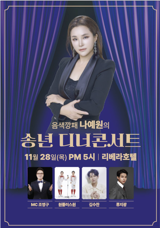 YNent트로트가수나예원의송년디너콘서트가11월28일(목)오후5시청담동리베라호텔베르사이유홀에서열린다.나예원은‘전국노래자랑’과‘가요무대’등유명방송에서다수의히트곡을선보이며,음색깡패라는별명을얻었다.특히그녀의대표곡‘잡힌물고기’와‘가슴을알죠’로청중들의마음을사로잡았으며,이번공연에서도수준급라이브를들려줄예정이다.디너쇼에는MC조영구가진행을맡았고,참여가수로는트로트가수김수찬과류지광그리고원플러스원이나선서무대를꾸민다.현장에서는다양한스페셜무대프로그램과함께관객과함께하는토크쇼소통도준비되어있다.또리베라호텔에서제공하는디너도함께제공된다.‘음색깡패나예원의송년디너콘서트’를기획한YN엔터테인먼트관계자는“입소문만으로방송과행사에최우선으로초대되어온실력파가수나예원의라이브를연말송년프로그램으로준비하게됐다”라며“힘들고지친마음을달래줄수있는즐거운시간이될수있도록특별프로그램과인기가수를초대해무대를꾸몄다”라고행사를소개했다.‘음색깡패나예원의송년디너콘서트’예매는YN엔터테인먼트전화예약을통해접수가가능하다.[MBN스타박소진기자[email protected]]<CopyrightⓒMBN(www.mbn.co.kr)무단전재및재배포금지>Copyright©MBN.무단전재,재배포및AI학습이용금지.
