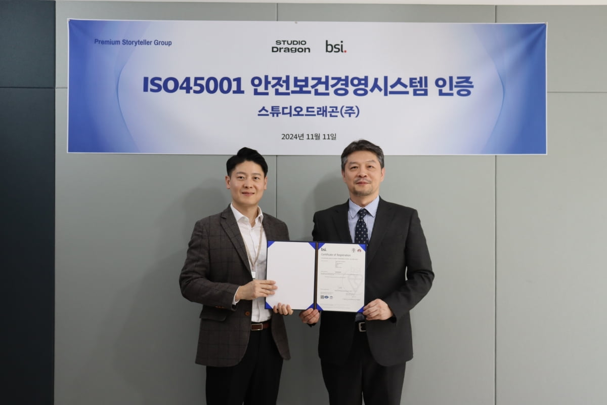 [텐아시아=류예지기자](사진설명:(좌)스튜디오드래곤안전관리팀이진형팀장(우)ISO국제인증기관bsi코리아임성환대표이사)스튜디오드래곤이‘안전보건경영시스템(ISO45001)'인증을획득했다고11일밝혔다.안전보건경영시스템(ISO45001)은국제표준화기구(ISO)에서제정한안전보건경영에관련된국제표준이다.해당인증은안전한근무환경조성을위한체계적인관리시스템을갖춘기업에게부여된다.스튜디오드래곤은2022년부터대표이사직속으로안전관리팀을만들어드라마제작현장에서의안전관리업무전문화를위해노력해왔다.제작현장안전매뉴얼을만들고,프로젝트별로안전관리담당자를따로두어교육하는한편,제작에참여하는모든스태프가세트장조성부터철거까지안전관리에유념할수있도록체계적인프로세스를다졌다.특히사다리작업시안전성결과가적힌표식을부착하는‘사다리안전Tag’제도를운영해추락재해를예방하고,반기별안전관리우수프로젝트포상을실시하여자발적안전의식을고취하고자노력하고있다.뿐만아니라참여스텝전원에대해단체상해보험을가입,운영함으로써만약의사태에대비하여피해를입는일이없도록살피고있다.스튜디오드래곤이진형안전관리팀장은“제작현장에서의사고는불시에예상치못했던곳에서발생할수있음을인지하고사고예방을위해수시점검,교육등에박차를가하고있다”며"안전을최우선으로생각하며일할수있는제작환경을만들어나갈것”이라고말했다.류예지텐아시아기자[email protected]©텐아시아.무단전재및재배포금지.
