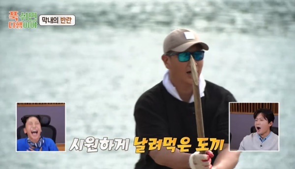 MBC‘푹쉬면다행이야’캡처MBC‘푹쉬면다행이야’캡처이대호가장작을패다가도끼를망가트렸다.11월4일방송된MBC‘푹쉬면다행이야’(이하‘푹다행’)에서는야구선수이대호,유희관,니퍼트,이대은이무인도호텔일꾼이됐다.부주장이된이대은은“저번에냉장고만드느라너무고생했다”며니퍼트제외이대호와유희관에게장작을패는미션을줬다.유희관은“조선의4번타자는도끼질을어떻게하는지”라며이대호의도끼질부터구경했다.이대호는한방에장작을쪼갰고모두가감탄했다.붐은“조각이나버린다.뒤로날아가는것처음본다”고극찬했다.이대호는“아무나4번타자하나?깔끔하잖아”라며자화자찬했다.안정환도“힘만있는게아니라기술도있다.잘한다”고했다.하지만이어이대호는장작을패다가시원하게도끼를날려먹었다.유희관이“뭐하는거야?왜장작을패다가도끼를패?”라며놀랐고안정환은“힘이얼마나센거야?”라며감탄했다.한참장작을패다가잠시쉬는시간이대은이“앉아서쉬는거아니죠?저거다패야해요”라며형들을재촉했다.이대호는분노의사자후와함께장작을더가져와계속장작을팼다.(사진=MBC‘푹쉬면다행이야’캡처)[뉴스엔유경상기자]뉴스엔유경상yooks@기사제보및보도자료[email protected]ⓒ뉴스엔.무단전재&재배포금지Copyright©뉴스엔.무단전재및재배포금지.