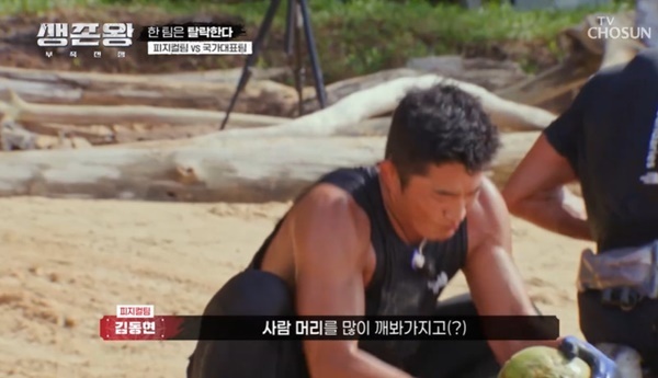 TVCHOSUN‘생존왕:부족전쟁’캡처TVCHOSUN‘생존왕:부족전쟁’캡처김동현과추성훈이코코넛을찢으며힘을과시했다.11월4일방송된TVCHOSUN신규서바이벌예능‘생존왕:부족전쟁’에서는국대팀과피지컬팀이1라운드최종탈락을두고데스매치를벌였다.국대팀정대세,박태환,김민지와피지컬팀추성훈,김동현,박하얀이2라운드진출을걸고데스매치를벌였다.데스매치미션은코코넛격파.바다에서25개,육지에서25개,총50개코코넛을모아격파해서수조에코코넛워터를많이모으는팀이승리.박태환은마린보이답게바다에서코코넛을모은뒤수월하게배를끌고오며앞서나갔다.추성훈과김동현은배를끌고오는방법을떠올리지못해헤맸다.하지만이어박하얀이핸드볼선수다운노룩패스로시간을단축시켰다.그사이국대팀이먼저육지가까운곳코코넛을싹쓸이했지만김동현이힘으로한번에8개씩코코넛을옮기며선방했다.코코넛을깨는데있어서도피지컬팀이유리했다.김동현은“추성훈형이랑저는사람머리많이깨봐서.코코넛도비슷한사이즈라.웬만하면한방이면끝난다.이정도면이길수도있겠다.해보자”고살벌하게말했다.추성훈은말그대로코코넛을찢었고,김동준이“코코넛을찢어버렸다”며놀랐다.그렇게피지컬팀이먼저코코넛워터로수조를넘치게만들며생존2라운드진출했다.국대팀정대세,박태환,김민지는아쉽게탈락했다.(사진=TVCHOSUN‘생존왕:부족전쟁’캡처)[뉴스엔유경상기자]뉴스엔유경상yooks@기사제보및보도자료[email protected]ⓒ뉴스엔.무단전재&재배포금지Copyright©뉴스엔.무단전재및재배포금지.