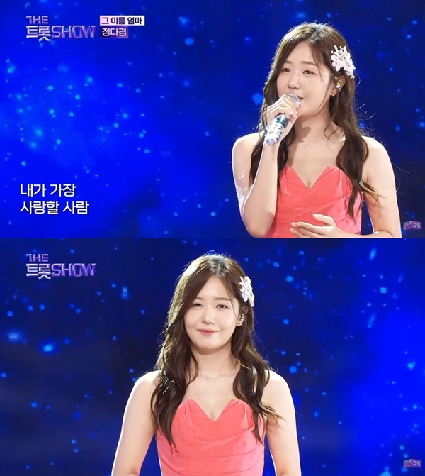 ▲4일방송된'더트롯쇼'에출연해'그이름엄마'무대를선사한정다경.방송화면캡처[스포티비뉴스=김원겸기자]가수정다경이감성가득한무대로팬들의마음을울렸다.정다경은지난4일방송된SBSFiL,SBSM'더트롯쇼'에출연해'그이름엄마'로무대를선사했다.핑크톤원피스를입고우아함과청초함을뽐낸정다경은특유의매력적인미성과함께마음을울리는깊은감성으로보는이들에게깊은여운을선사했다.지난해발매된정다경의노래'그이름엄마'는애틋한바이올린선율로시작해말하듯이이어지는정다경의담담한목소리가인상적인곡이다.늘뒤에서자식을위해희생하고마음졸이는이시대의모든어머니들에대한감사와미안함을진솔하게담아내며많은공감을이끌어냈다.한편이날'더트롯쇼'에는정다경을비롯해김나희,나미애,마이진,박지현,성민,유지나,태진아,홍자,복지은,손태진,신유등이출연했다.<저작권자ⓒSPOTVNEWS.무단전재및재배포금지>Copyright©스포티비뉴스.무단전재및재배포금지.