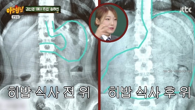 JTBC‘아는형님’캡처JTBC‘아는형님’캡처[뉴스엔서유나기자]먹방크리에이터히밥의식사전후위크기비교샷이공개됐다.2월28일방송된JTBC예능'아는형님'(이하'아형')519회에서는김신영,테이,송하빈,히밥이형님학교로전학을왔다.이날히밥은어느정도먹었을때한계를느끼냐는질문에"한라면25개?"라고답해6봉을먹는강호동을주눅들게만들었다.서장훈은"병원에서위장검사를해본적있냐"고물었고히밥은"내가공복일때위랑,먹고나서위를찍었는데위가진짜다른장기를다밀어내더라"고답했다.공개된10인분을먹고찍은위사진이놀라움을자아냈다."(위의)신축성이좋다더라"고자랑한히밥은건강검진도"저번주에했다"며"3명이같이갔는데제일좋다더라"고결과를전했다.뉴스엔서유나stranger77@기사제보및보도자료[email protected]ⓒ뉴스엔.무단전재&재배포금지Copyright©뉴스엔.무단전재및재배포금지.