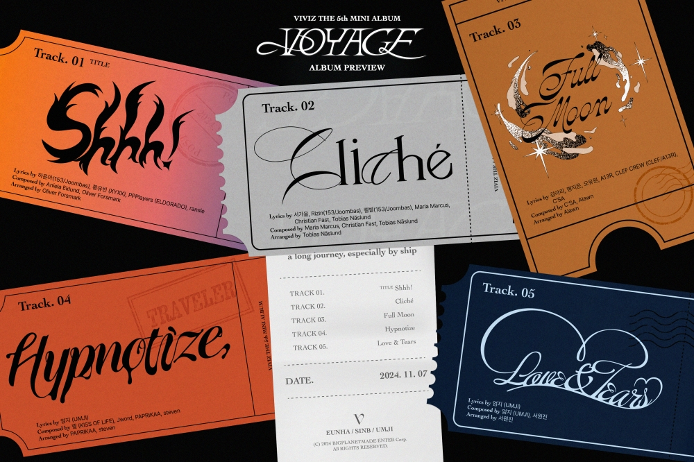[스타뉴스|한해선기자]/사진=빅플래닛메이드엔터그룹VIVIZ(비비지)가미니5집'VOYAGE(보야지)'의앨범프리뷰영상을공개하며컴백열기를더했다.30일,VIVIZ의공식채널에공개된앨범프리뷰에는타이틀곡인'Shhh!(쉿!)'을비롯해'Cliche(클리셰)','FullMoon(풀문)','Hypnotize(힙노타이즈)','Love&Tears(러브앤티어스)'등총5곡의음악과함께마치우주를여행하는듯한영상을담아냈다.특히자신의매력에빠져들고있는상대에대한자신감을담아낸가사가인상적인타이틀곡'Shhh!'은멤버들의매력적인보컬과라틴리듬이조화를이루며강한중독성을선사하고있다.'Shhh!'외에도브라스리프가특징인'Cliche(클리셰)',업비트의드럼앤베이스리듬을사용한'FullMoon(풀문)',슬로잼R&B장르의'Hypnotize(힙노타이즈)',신스팝장르의'Love&Tears(러브앤티어스)'등다양한장르의곡들이짧지만깊은인상을남기며새앨범에대한기대를한껏높이고있다.VIVIZ는미니5집'VOYAGE'발매당일인11월7일팬들과의특별한만남도준비했다.발매당일저녁7시30분반포한강공원세빛섬예빛무대에서스페셜스테이지를개최하는것.1년전미니4집'VERSUS(벌서스)'발매이후1년여만에다시한번공개된장소에서새앨범을선보이며특별한시간을가질예정이다.미니4집이후1년여만에새앨범으로돌아온VIVIZ의미니5집'VOYAGE'는11월7일오후6시전격공개된다.한해선기자[email protected]©스타뉴스&starnewskorea.com,무단전재및재배포금지