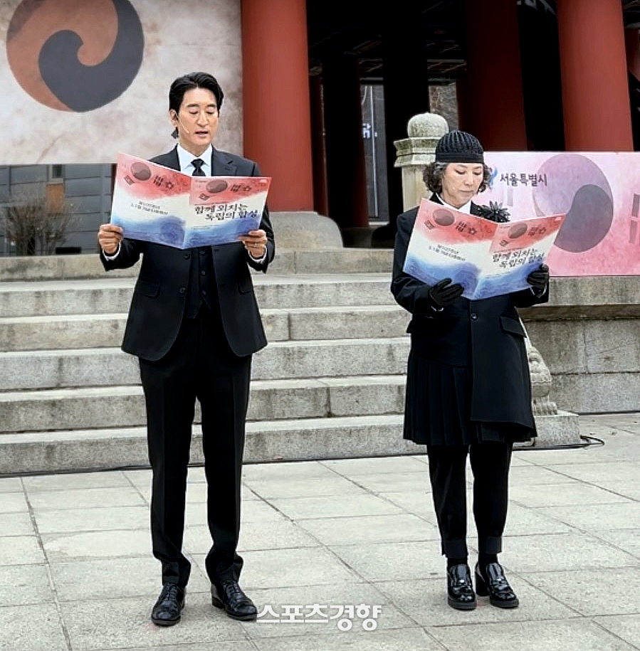 신현준서울시명예시장참석모든참석자와함께만세삼창국가유공자가족자격의의미3·1절보신각타종행사에참석한배우신현준과고두심.HJ필름제공배우신현준과고두심이제107주년3·1절보신각타종행사에서기미독립선언서를낭독했다.신현준과고두심은3월1일오전서울종로구보신각일대에서열린타종행사에참석했다.이번행사는함께외치는독립의함성을주제로개최됐다.서울시명예시장자격으로무대에오른신현준은고두심과교차낭독형식으로기미독립선언서를읽었다.두사람은약5분간선언문을낭독했다.선언문에는“이세상어떤것도우리독립을가로막지못한다”는문구가포함됐다.3·1절보신각타종행사에참석한배우신현준.HJ필름제공낭독후에는참석자전원이만세삼창을외쳤다.삼일절노래합창과기념촬영도진행됐다.6·25전쟁참전국가유공자의가족인신현준은“3·1절의의미를다시한번가슴깊이새기는자리였다.6·25참전국가유공자이신아버지를비롯해나라를위해헌신하신분들의희생과용기를기억하며,우리가지켜야할가치가무엇인지되돌아보는계기가됐다”고했다.행사에는서울시장과시의회의장,종로구청장,독립유공자후손등이참석했다.이선명기자[email protected]©스포츠경향.무단전재및재배포금지.