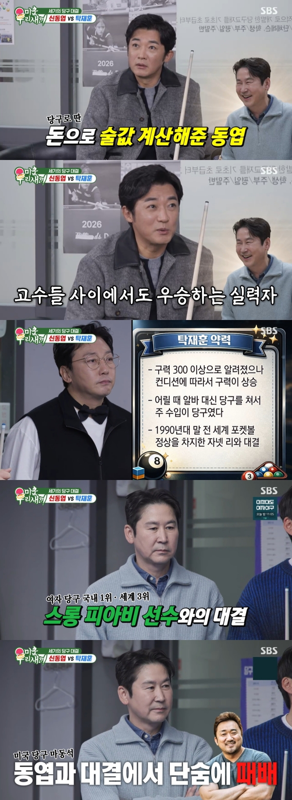 사진=SBS[스포츠투데이김태형기자]안재욱이신동엽의당구실력을증언했다.4일방송된SBS'미운우리새끼'에는신동엽과탁재훈의당구대결이그려졌다.이날두사람의대결을보기위해안재욱,정준호,김준호,조진세가당구장을찾았다.신동엽과같은서울예대출신인안재욱은"동엽이는우리대학교다닐때당구쪽으로는전설이었다.연극할때돈없으면우리먼저술마시고있고동엽이는당구로딴2~3만원으로술값을계산해줬다"고밝혀놀라움을안겼다.이어"신촌쪽에동엽이가아는형이당구장을하는데거기는고수들이대회한다.거기에서도우승해서10만원이렇게따오면다같이나이트클럽가고그랬다.당구로우리를먹여살렸다"고떠올렸다.이에신동엽은"옛날얘기"라며"400점정도쳤다.그게100m달리기로치면11초대기록이다.아마추어중에서는굉장히빠른것"이라고말했다.당구대결시작전,김준호는먼저탁재훈의당구약력으로"구력300이상으로알려졌으나컨디션에따라구력이상승한다.어릴때알바대신당구를쳐서주수입이당구였다.1990년대말전세계포켓볼정상을차지한자넷리와당구대결을펼쳐서아주근소한차이로패배했다.현재방송이없어제주도에서당구를많이친다.그래서구력이올라왔다"고읊었다.조진세는신동엽의약력으로"주종목이3구쓰리쿠션,최고구력400~500,대학시절모든술값을당구로벌었다고해도과언이아닌서울예대당구의전설이다.2019년에는여자당구국내랭킹1위,세계3위를달성한당구여왕스롱피아비와대결해아슬아슬하게패배했다.또미국에서트레이너를하던마동석씨가당시미국당구장을접수했었지만,신동엽을우연히만나단숨에당구패배하며마동석에게실패의쓴맛을안겼다"고밝혔다.이에신동엽은"동석이가한국당구장의왕이었다.그런데거기서만나서대결한거다.힘은좋지만내가기술로이겼다"고말해눈길을끌었다.한편개인전에서는신동엽이탁재훈에10대4승리를거두며실력을증명했다.이어진동엽팀과재훈팀의3:3대결결과는재훈팀이이겼다.[스포츠투데이김태형기자[email protected]]Copyright©스포츠투데이.무단전재및재배포금지.