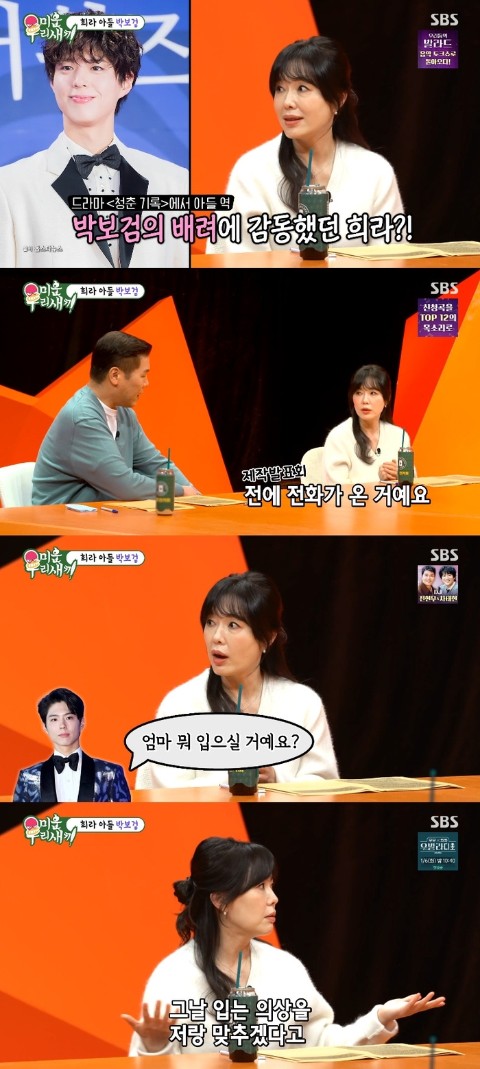 ‘미운우리새끼’사진|SBS하희라가박보검의미담을전했다.4일오후방송된SBS예능프로그램‘미운우리새끼’(이하‘미우새’)에는하희라가출연해박보검을칭찬했다.이날방송에서하희라는제작발표회전날에전화가왔다며“‘엄마뭐입을거냐’고묻더라.알고보니옷을맞춰입자고했던것.보통커플역이면같이맞춰입어도엄마와아들이맞춰입는경우는처음이었다”고말했다.그러면서“항상문자주고받고안부연락이먼저온다.제대하고제가집밥해준다고해서같이된장찌개끓여서먹었다”고덧붙였다.신동엽은“백상예술대상을꽤오래함께하고있다.1년에한번보는데도한보따리뭔가를챙겨준다.억지로뭔가를하려면티가나는데진심이다”며박보검의마음씨를칭찬했다.‘미운우리새끼’는일요일오후9시5분SBS에서방송된다.[서예지스타투데이객원기자]Copyright©스타투데이.무단전재,재배포및AI학습이용금지