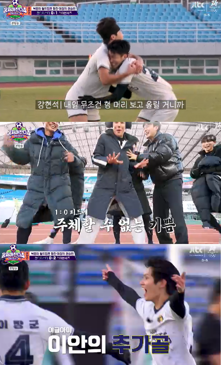 (MHN김소영기자)'뭉쳐야찬다4'감독안정환과이동국이결승을앞두고전에없던예민함을드러냈다.1일방송된JTBC'뭉쳐야찬다4'42회에서는판타지리그최종우승을가리는파이널매치가펼쳐졌다.이날이동국의'라이온하츠FC'는안정환의'FC환타지스타'와마지막승부를벌였다.전반내내양팀모두골을내지못하고고전하던가운데,전반전5분을남겨둔시점에서라이온하츠FC측이파울로프리킥을내어준다.이에한은성과시우민은"아니왜","지나가고넘어지는데"라고말하며억울해했다.다행히프리킥은볼로이어지지않고커트됐다.안정환역시중간중간심판판정에강하게반응하며항의하기도.첫골은모두의예상을깨고전반30분라이온하츠FC에서터졌다.강현석과이용우가만든골이었다.사자군단은'매끈매끈하다'춤을추며첫골의기쁨을즐겼다.안정환은"왜맨투맨을안잡고있냐"며고개를숙였다.두번째골역시라이온하츠FC에서터졌다.이안선수의발리슛골에김남일은"아무도라이온하츠가전반전에2대0으로앞서나갈거라생각한사람없다"며흥분했다.이렇게전반전이끝이났다.안정환은망연자실한선수들에게"0대0이라생각해라.30분이나남았다"며멘탈을다잡았다.사진=JTBCCopyright©MHN.무단전재및재배포금지.