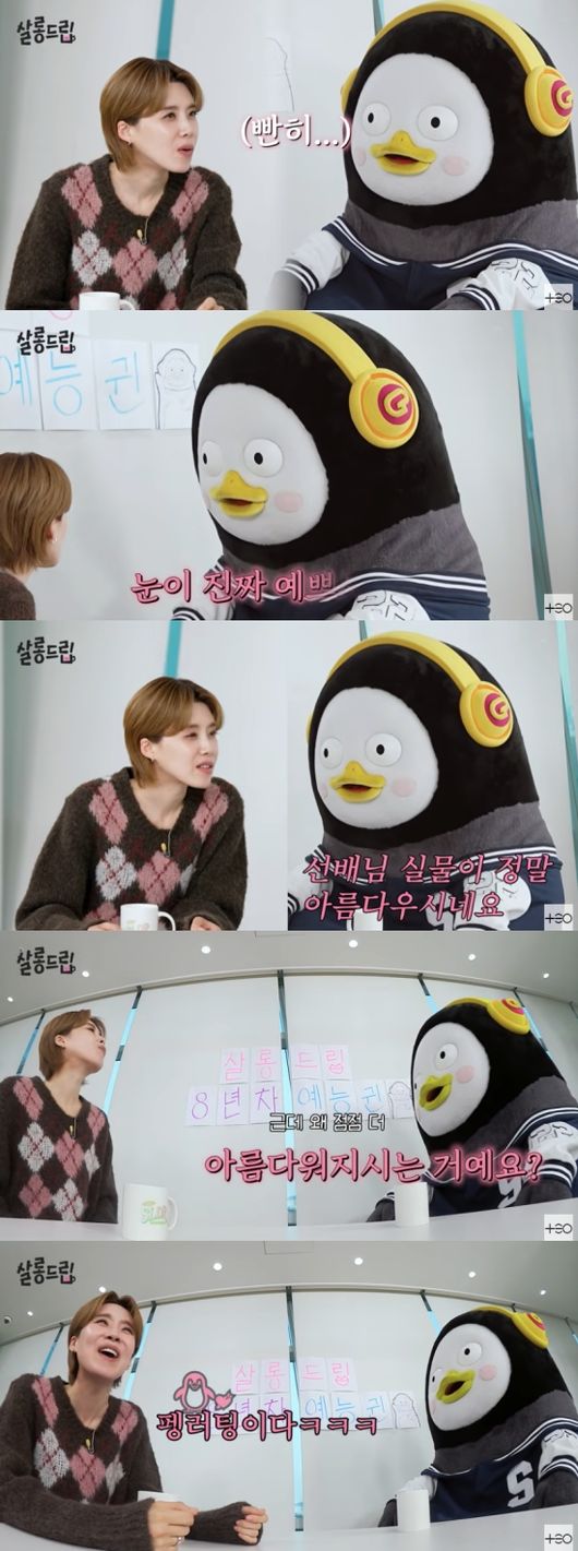 방송시청후작성된리뷰기사입니다.[OSEN=임혜영기자]펭수가장도연의미모를칭찬했다.3일채널‘테오’의‘살롱드립’에는‘서바이벌계에혜성같이등장한펭플루언서ㅣ펭수’라는영상이게재됐다.펭수는장도연의얼굴을빤히쳐다본후“눈이진짜예쁘다.실물이정말아름답다.데뷔한지지금19년차아니냐.왜점점더아름다워지는것이냐”라고실물칭찬을쏟아냈다.장도연은“미쳤나봐”라고환호한후“펭러팅이다”라고덧붙였다.장도연은펭수에게사람나이로따지면몇살이냐고물었고펭수는거의50살이라고밝혔다.이를들은장도연은“해볼만하겠는데?나42살이다.8살(차이면)나쁘지않다”라고말해웃음을자아냈다./[email protected][사진]채널‘테오’Copyright©OSEN.무단전재및재배포금지.