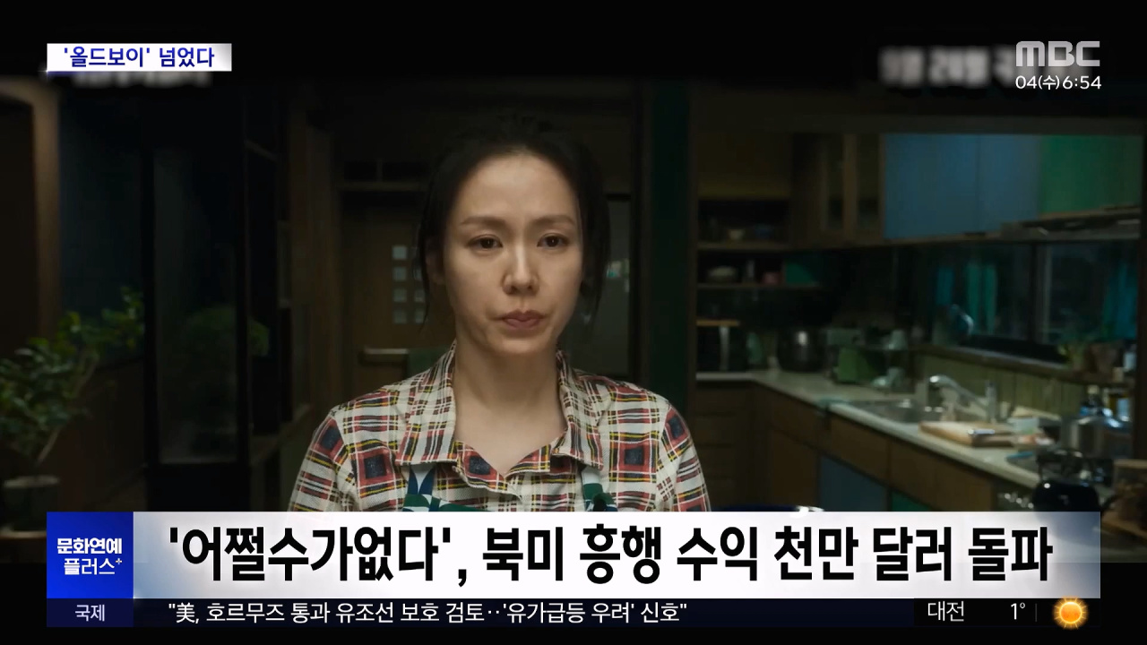 [뉴스투데이]영화'어쩔수가없다'가북미흥행수익1천만달러,우리돈으로150억원을돌파했습니다.이로써'어쩔수가없다'는북미에서개봉한박찬욱감독작품중최고흥행수익을기록했는데요.박감독의전작'올드보이'의흥행수익240만달러를훌쩍뛰어넘은성적입니다.나를위한자리가없다면내가만들어서라도취업에성공하겠다며수상한작전에나선가장의이야기를다룬영화'어쩔수가없다'는지난해12월북미일부극장에서개봉한뒤지난달엔약7백개로상영관이확대됐습니다.지금까지문화연예플러스였습니다.MBC뉴스는24시간여러분의제보를기다립니다.▷전화02-784-4000▷이메일[email protected]▷카카오톡@mbc제보장유진리포터기사원문-https://imnews.imbc.com/replay/2026/nwtoday/article/6804707_37012.htmlCopyright©MBC&iMBC무단전재,재배포및이용(AI학습포함)금지