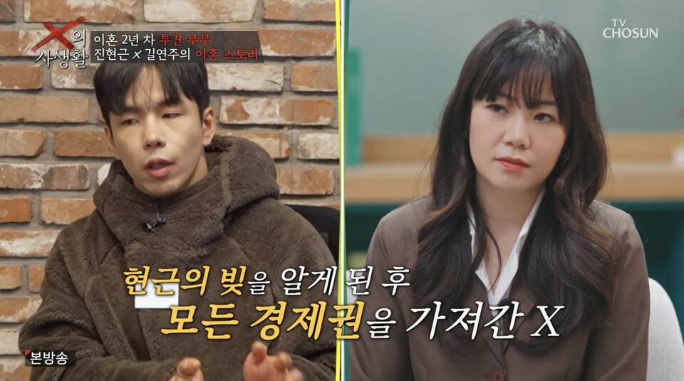 ⓒTV조선'X의사생활'[스포츠한국김도아기자]'X의사생활'투견부부가상견례에서도폭행이있었고결혼후점점수위가높아졌다고밝혔다.7일방송된TV조선'X의사생활'에서는JTBC'이혼숙려캠프'에투견부부로출연했던진현근,길연주의두번째이야기가공개됐다.이날방송에서는길연주가스튜디오에등장해전남편진현근이결혼과정에대해말하는모습을지켜봤다.진현근은29살일때소개팅어플을통해27살이던길연주와만났다며"제가까만편이다보니까하얗고눈크니까외적으로마음에들었다"고말했다.그는길연주가살던동네에서처음만나4차까지가며새벽까지함께있었고,집에데려다주겠다는자신을극구거절하고보내는길연주의모습에"쉬운사람은아니네"라생각해매력을느껴연애를결심했다고전했다.두사람은연애를시작한지6개월도안돼혼전임신으로아이를갖게됐고결혼했다.진현근은"아이낳고얼마안있다가제빚에관련된게나오면서불신이쌓이기시작했다.이자까지다해서5000만원이됐다"며자신의숨겨진빚이드러나면서부부갈등이시작됐다고밝혔다.길연주는진현근이자신을속였다는생각에배신감을느껴술을마시고진현근을일부러괴롭혔다고고백했다.진현근은길연주에게모든경제권을넘긴후에도서로고성을지르고폭력을휘두르며심하게싸웠다.이때문에경찰이수시로출동했다.스튜디오에서길연주는자신이잘못했다며"내가그때는괴물이었구나"라고담담하게과오를인정했다.진현근은길연주가돈을아낀다며온수를못쓰게했다며"애초에모순인게정말아끼려고했다면본인은술을포기해야하지않나"라고지적했다.이어"술을마시면언성이높아지고감정조절이안된다"며길연주에게술문제가있었다고강조했다.ⓒTV조선'X의사생활'또"술마시고젓가락을집어던졌고돌돌이로제눈을찍었다.두번째는애를안고있었는데발로제눈을찼다.부딪히면서안와골절이왔고앞이안보였다"고길연주에게폭행을당했다고말했다.진현근은"상견례자리에서뺨을맞았다,길연주한테"라고폭로했고,길연주는"뺨이아니고가슴을때렸는데주먹으로?기억이왜곡된것같다"고진현근이지난주방송에서한말과똑같은말을했다.진현근은2024년있었던상견례사건에대해"전날까지싸웠다.부모님들다앉아있는데저보고화장실로따라나오라더라.'네가뺨맞겠다고했지?'이러고뺨을바로(때렸다).부모님계시니까끝나고때리라고했는데안된다고지금때려야겠다더라"고설명했다.이에대해길연주는뺨이아니라주먹으로가슴을때렸고,진현근의눈을돌돌이로때린이유는"양쪽싸대기를맞고제가눈이돌아서"라고말했다.길연주는결혼전연애기간에는폭력은커녕욕이나폭언도없었다며결혼후갈등이커지면서점점폭력수위가높아졌다고밝혔다.투견부부의결혼및이혼과정을들은MC들은하나같이"잘이혼했다"고말했다.스포츠한국김도아기자[email protected]©스포츠한국.무단전재및재배포금지.