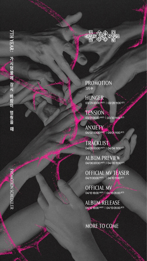 빅히트뮤직투모로우바이투게더가다채로운프로모션으로컴백에대한기대감을끌어올린다.투모로우바이투게더(수빈,연준,범규,태현,휴닝카이)는5일0시팀공식SNS에미니8집‘7THYEAR:가시덤불에잠시바람이멈췄을때’프로모션스케줄러를공개했다.흑백톤의이미지속뒤엉킨멤버들의손사이로형광빛가시덤불이뻗어나간다.대비를이루는색감과가시를시각화한상징적인오브제가어우러져강렬한인상을남긴다.투모로우바이투게더는앞서신보의분위기를담은공식트레일러와‘THORN’버전의콘셉트포토를공개해새로운챕터의서막을열었다.오는3월29일부터4월2일까지‘HUNGER’,‘TENSION’,‘ANXIETY’버전의사진이추가적으로베일을벗는다.이후4월5일트랙리스트,4월6일앨범프리뷰가공개돼신보윤곽이드러난다.4월11일에는타이틀곡뮤직비디오티저로컴백열기를고조시킬전망이다.3월중전개되는베일에싸인프로모션과‘MORETOCOME’이라는문구는전세계모아(MOA.팬덤명)의호기심을자극한다.투모로우바이투게더는4월13일오후6시미니8집‘7THYEAR:가시덤불에잠시바람이멈췄을때’전곡음원과타이틀곡뮤직비디오를공개한다.신보발매당일오후8시고려대학교화정체육관에서온·오프라인컴백쇼케이스를개최하고전세계팬들과함께새로운챕터를연다.[MBN스타박소진기자[email protected]]<CopyrightⓒMBN(www.mbn.co.kr)무단전재및재배포금지>Copyright©MBN.무단전재,재배포및AI학습이용금지.