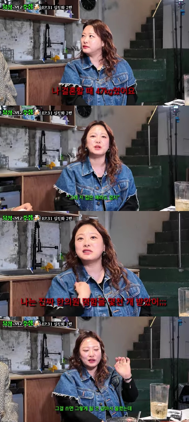 [스타뉴스|김나연기자]심진화/사진=유튜브채널유정그리고주정코미디언심진화가2세를포기하게된이유를솔직하게밝혔다.23일유튜브채널'유정그리고주정'에는심진화가게스트로출연해다양한이야기를나눴다.심진화는"나는28kg쪘다가22kg뺐다.결혼할때47kg였다"면서"작년에어떤사람한테상처받고세시간정도울었다.근데원효씨가맛있는걸시켜놓고,나우는거다들어줬다.그날'내옆에는남편이있구나'라는걸느끼고,그날부터변해서더사랑하게됐다"고애정을표현했다.이어"우리가너무행복하니까'저집은애라도없지'라고하는데오히려다행이다.우리는진짜행복하다"라고덧붙였다.앞서심진화는지난해"아이없이잘살기로했다.아이응원그만해주셔도된다"면서2세를포기했다고밝힌바있다.그는"사실아이를갖기위한노력을안한지는꽤됐다.온국민이만날때마다물어보고,한의원명함을몇천개받았다"면서"강재준이은형부부아들돌잔치를간뒤에우리끼리재밌게살자고마음먹었다고써서올렸는데,기사가막나오더라.오히려잘된것같다"고덧붙였다.김나연기자[email protected]©스타뉴스&starnewskorea.com,무단전재및재배포금지