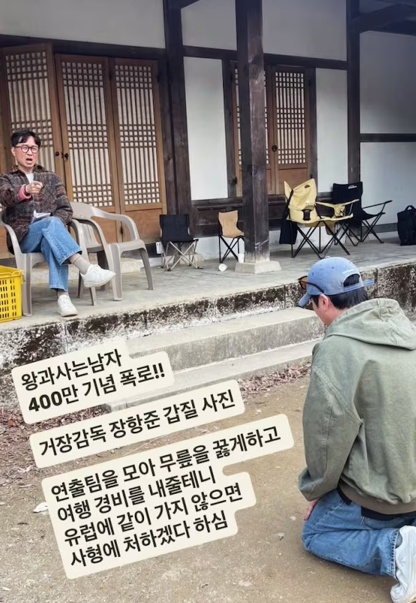 "다함께유럽여행제안"'왕과사는남자'스태프SNS캡처영화'왕과사는남자'가400만관객을모으며흥행중인가운데해당작품을연출한장항준감독의미담이공개됐습니다.‘왕과사는남자’연출팀스태프A씨는그제(18일)소셜미디어에"400만돌파기념폭로,거장장항준감독의갑질사진"이라는글과함께사진한장을공개했습니다.사진에는장감독이무릎을꿇은스태프를향해다리를꼰채손가락질하며호통치는듯한모습이담겼습니다.다만이는장감독이스태프들과유럽여행을제안하는과정에서연출된장면으로알려졌습니다.A씨는"연출팀을모아무릎꿇게하고여행경비를내줄테니유럽에같이가지않으면사형에처하겠다고했다"고사진속장면에대해설명했습니다.장감독의스태프사랑은이번이처음이아닙니다.지난2023년개봉한영화‘리바운드’촬영당시에도주연배우안재홍과스태프들과함께이탈리아여행을간것으로전해졌습니다.당시장감독은항공은물론숙박,식비까지모든비용을책임졌다고합니다.한편,‘왕과사는남자’는설연휴(14~18일)닷새동안267만5460명을동원하며박스오피스1위를달렸고,현재누적관객수는441만명에달합니다.이작품은조선시대를배경으로숙부에게배신당해폐위된단종이강원도영월청령포로유배가게되고,그마을촌장엄흥도를만나면서벌어지는이야기를그립니다.'왕과사는남자'포스터/사진=연합뉴스[조수민디지털뉴스부인턴기자[email protected]]<CopyrightⓒMBN(www.mbn.co.kr)무단전재및재배포금지>Copyright©MBN.무단전재,재배포및AI학습이용금지.
