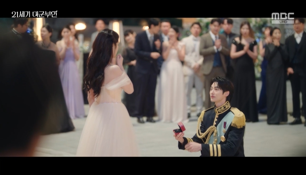MBC금토드라마21세기대군부인방송화면캡처MBC금토드라마21세기대군부인방송화면캡처MBC금토드라마21세기대군부인방송화면캡처MBC금토드라마21세기대군부인방송화면캡처MBC금토드라마21세기대군부인방송화면캡처MBC금토드라마21세기대군부인방송화면캡처[뉴스엔강민경기자]MBC금토드라마'21세기대군부인'속에서변우석이아이유에게무릎을꿇고공개프러포즈를했다.4월25일방송된MBC금토드라마'21세기대군부인'에서는왕실주요행사인내진연에서이안대군(변우석)이성희주(아이유)에게무릎을꿇고공개프러포즈하는모습이그려졌다.성희주는이안대군과팔짱을끼고내진연에참석했다.성희주와이안대군은대비윤이랑(공승연)과민정우(노상현)에게인사했다.성희주와이안대군은음악에맞춰왈츠를추기시작했다.윤이랑은민정우에게"이안의부탁이었습니다.이별선물을대단히하고싶은모양인데협조해줘야죠"라고말했다.이안대군은성희주에게"이걸써먹을때가있네"라고했다.이를들은성희주는"자주추시는거아니었어요?"라고물었다.이안대군은"이거배우는게제일싫었어"라고답했다.성희주는"저도요"라며동의했다.이안대군은내진연에참석한사람들을둘러본뒤"그래도이정도면효과는꽤있는것같은데다들우리만보잖아"라고했다.이어"후배님은나만봐야지.우리가죽고못사는것처럼"이라고덧붙였다.성희주는"알겠는데이정도로는안돼요"라고했다.이안대군은"알아"라고밝혔다.왈츠무대가끝난뒤이안대군은"알아서잘따라와"라며성희주앞에무릎을꿇고반지를내밀었다.이안대군이성희주에게내민반지는어머니의연왕후(김소현)의유품이었다.이안대군은"후배님에비하면내걸음이많이느릴겁니다.그래도내아내가되어주시겠습니까?"라고말했다.성희주는웃으면서고개를끄덕였다.이안대군은성희주에게반지를끼워줬다.두사람은손을잡고왕인이윤(김은호)앞으로갔다.이안대군은"전하,저희의혼인을허락해주시겠습니까?"라고물었다.이윤은"허락합니다.행복하십시오숙부님.성대표도요"라며두사람의혼인을허락했다.뉴스엔강민경swan@기사제보및보도자료[email protected]ⓒ뉴스엔.무단전재&재배포금지Copyright©뉴스엔.무단전재및재배포금지.