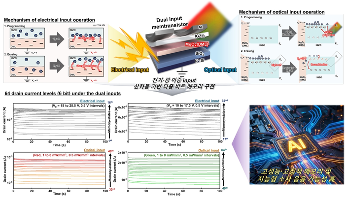 연구팀이개발한전기및광이중입력멤트랜지스터개념도및멀티레벨메모리특성.〈이미지=연세대김현재연구팀〉연세대연구팀이인공지능(AI)시대메모리성능과저장용량을획기적으로높인'산화물반도체'기술개발에성공했다.22일업계에따르면연세대학교전기전자공학과김현재교수연구팀은이와같은연구결과를담은'이중입력기반멀티레벨메모리'기술을재료과학분야세계적권위지인독일'어드밴스드펑셔널머티리얼즈(AFM)'에발표했다.연구팀은기존반도체방식인전기적신호제어(0과1)에'빛'이라는새로운변수를추가했다.빛과전기라는두가지독립된입력을제어해단일소자에서64개의멀티레벨상태(64-level)를구현하는데성공했다.이기술을활용하면정보를담는'그릇'의개수가소자당64배늘어난다.반도체칩의물리적크기를늘리지않고도처리정보량을확장가능해,HBM이후고집적차세대메모리구현에핵심적인역할을할전망이다.이번연구는전력소모가크고미세화가어려운기존실리콘반도체의한계를'산화물반도체'로극복한것이핵심이다.특히전기와빛두가지신호를모두활용하는방식은최근반도체업계가데이터전송속도를높이기위해도입중인'실리콘포토닉스(광반도체)'기술과궤를같이한다.빛을신호로직접받아들여정보를처리하기때문에데이터전송중발생하는열과병목현상을획기적으로줄일수있다.이와같은고도의병렬연산처리능력은인간의뇌시냅스연결강도를모사하는'뉴로모픽(뇌모사)'컴퓨팅환경에서도필수다.김현재교수는“현재우리메모리산업이주력하고있는HBM그다음레벨은결국'뉴로모픽'컴퓨팅”이라며“이처럼이번연구는기존의전기신호방식에빛을더해차세대컴퓨팅을구현할수있는소자기술을확보했다는데의의가있다”고설명했다.연구팀은이와더불어'강유전체트랜지스터(FeFET)'의안정성문제를해결한연구성과도최근공개했다.FeFET는D램등에서데이터저장역할을하는캐패시터를없애고트랜지스터자체가메모리기능을수행하게만든소자다.비휘발성특성과저전력동작이장점이다.현재삼성전자등주요반도체기업들이D램의물리적한계를극복하기위해집중하고있는'캐패시터리스(Capacitor-less)'메모리의핵심기술로꼽힌다.다만반복적인동작시발생하는데이터오류와짧은수명이상용화의걸림돌이었다.김현재교수팀은반도체내부의'산소결함'을위치별로정밀하게조절하는독자적인공법을도입해이를해결했다.10년이상데이터보존가능성과1000만회이상의반복동작안정성을실험으로확인했다.이형두기자[email protected]©전자신문.무단전재및재배포금지.