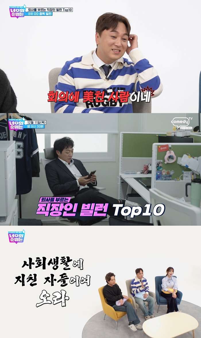 사진|코미디TV‘너의순위는’[스포츠서울|조선경기자]직장인들의멘탈을갉아먹는‘진짜빌런’들이’너의순위는‘에총출동한다.11일방송되는코미디TV‘너의순위는’에서는직장인이라면누구나공감할수있는현실적인문제들을다룬‘퇴사를부르는직장인빌런Top10’이공개된다.첫번째로소개되는빌런은바로‘회의중독빌런’이다.끝날듯끝나지않는회의로하루가증발하는현실에출연진들은깊은탄식을내뱉는다.“이게진짜지옥의시작”이라며고개를절레절레흔드는스튜디오분위기속,사회생활의불편한진실이줄줄이폭로된다.이어‘꼰대상사VSMZ신입’사이에서어느쪽도편들수없는직장인의처절한생존기가펼쳐진다.‘열정은넘치지만일머리는부족한MZ신입’과‘업무떠넘기고운전까지시키는꼰대상사’등실제직장내에서벌어지는빌런사례들이등장하며폭발적인공감을자아낸다.특히,이루다의소름돋는빌런연기는뮤지와황제성마저얼어붙게만들며스튜디오를술렁이게했다.직장인들의PTSD를유발할만큼현실적인빌런퍼레이드,‘퇴사를부르는직장인빌런Top10’편은11일밤9시30분코미디TV에서방송된다[email protected]©스포츠서울.무단전재및재배포금지.
