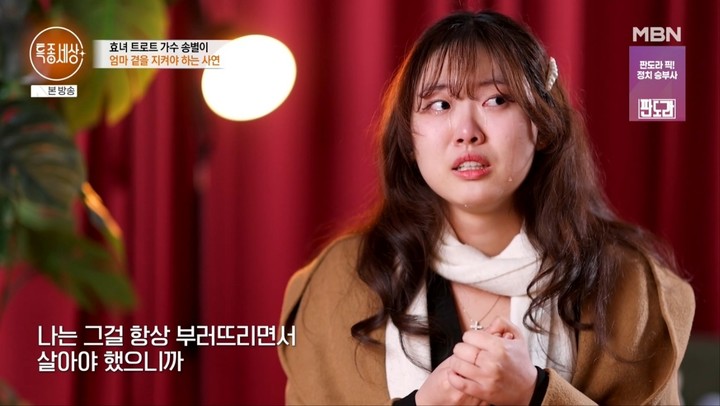송별이모녀의서로를향한미안함…꿈은'가족과함께살집짓기'(MHN박선하기자)'천재소녀'로불리던효녀트로트가수송별이가학업도포기하고엄마곁을지키고있는이유가공개됐다.5일방송된MBN'특종세상'에서는신부전증을앓는어머니의곁을지키며일찍부터포기하는법을배워야했던송별이의사연이소개됐다.송별이는10대시절부터바쁜아버지를대신해신부전증을앓고있는어머니의곁을지켜왔다.어린나이였지만병원일정과집안사정을자연스럽게감당해야했다.그런모녀에게갈등이생긴건,아이러니하게도송별이의공연일정때문이었다.투석이있는날만큼은무대에서고싶지않은딸과,딸의앞길을막는존재가되고싶지않은어머니의마음이엇갈리고있는것.송별이는"투석날에는장애인활동지원사선생님이오셔도제가챙겨야할게많다"며그날만큼은스케줄을잡고싶지않다고털어놨다.어머니역시딸의마음을이해하지만,자신때문에딸이일을포기해야하는현실이더힘들다.결국어머니는"내병원때문에행사를포기해야한다면차라리요양병원에들어가겠다"며차마꺼내고싶지않았던말까지꺼내들었다.딸을설득하기위한말이었지만,어머니의마음은편치않았다.그는"병원에가는날이면누가잡아줘도어지럽다.집에와서도하루종일누워있어야한다.그래서딸이병원에같이가고싶어하는것"이라며눈시울을붉혔다.송별이는'트로트신동'으로유명하다.여섯살에데뷔해지금까지24장의앨범을냈고,'헬로트로트'에서베스트11에오르며주목을받았다.그에게무대에올라노래하고팬들을만나는시간은,힘겨운일상을버티게하는위로였다.그는현재변호사를꿈꾸며독학학위제로법학공부를이어가고있다.학원한번다니지않고도줄곧전교1등을차지한그는'천재소녀'라는말로도불렸다.하지만고등학교에들어서며학교에다니는것조차포기해야했다.그이유역시어머니의간병이었다.송별이의가족에게도평범하고단란했던시절이있었다.그러나어머니가약물알레르기로혼수상태에빠지면서모든것이달라졌다.집안경제가무너졌고,어머니를돌보는것은송별이의몫이됐다.어머니는"내가아파서가정이다망가졌다.내가너무미안하다"며울먹였다.송별이는가장큰슬픔을'포기하는법을일찍배운것'이라고말했다.그는"내상황때문에하고싶은걸자주내려놔야했던게가장슬펐다.나도유학도가고,남들처럼꿈을키워보고싶었다"며"어릴때부터꿈을꺾는법을먼저배워야했던게아직도슬프다"며눈물을흘렸다.그런송별이의꿈은성공해서제주도에부모님과함께살수있는집을짓는것이다.힘든시간끝에따뜻한꽃길이찾아오길바래본다.사진='특종세상'방송화면Copyright©MHN.무단전재및재배포금지.