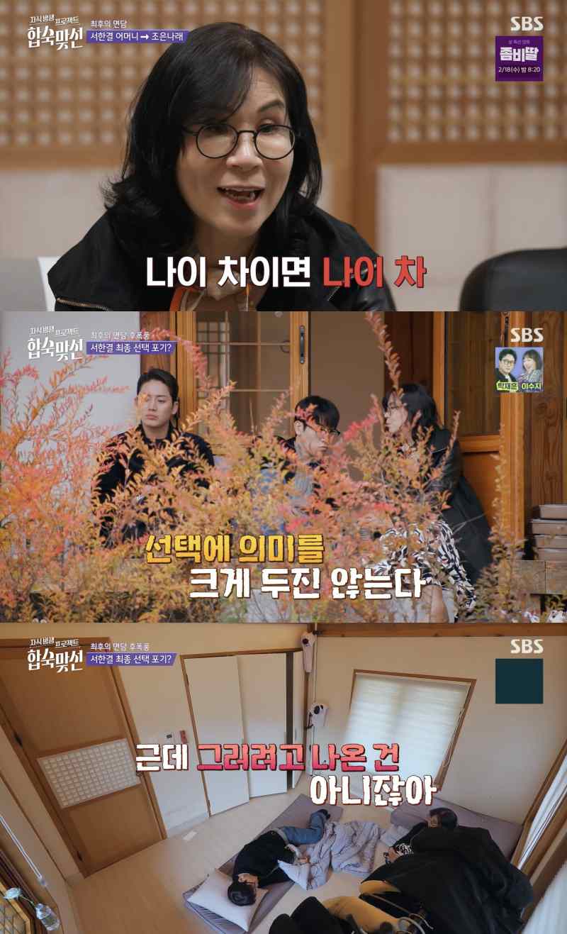 ⓒSBS'자식방생프로젝트합숙맞선'[스포츠한국김희원기자]'합숙맞선'서한결이최종선택을앞두고어머니를통해들은조은나래의마음을듣고고민에빠졌다.5일방송된SBS'자식방생프로젝트합숙맞선'에서는최종선택을앞두고어머니들의최후의면담이이뤄졌다.이날서한결어머니는7살의나이차이를걱정했던조은나래와최후의면담을했다.그는"어머니가한결이를너무예쁘게봐주셨다.은나래씨가더예쁜데도충분히칭찬해주지못해서미안하다"고말했다.조은나래는"저는한결이가칭찬많이해줬다"며"진심으로감사드린다"고인사했다.그는서한결을향한마음이어느정도냐는서한결어머니의질문에"그날밤에한결이와나눈솔직한대화이후로호감도가많이상승했다.이성적인느낌도느껴지는것같다"고답했다.이에서한결어머니는"저는걸리는게마음을떠나서단편적으로보이는부분,나이차이면나이차같은부분들을(한결이도)엄마가우려하는걸분명히알것같다.한결이형하고5살터울이니까.한결이아닌다른사람을만났으면전혀문제가안될부분인데한결이어서그렇다"고7살의나이차이를짚었다.조은나래는"당연히그렇다고생각한다"며이해한다고밝혔다.이어"그렇지만선택을하게된다면그게다괜찮다는의미로저는받아들일거다"라고말했다.서한결어머니는조은나래어머니가결혼을서두르는것같다며최종선택의의미에대해서도궁금해했다.조은나래는"저는그렇게까지무겁게생각하진않고있다.더알아가보는정도의가벼운의미가되지않을까싶다.우려되는부분들에대해서도조금은알아가봐야실제로수용가능한부분인지경험을해봐야느낄수있다고생각한다"고털어놨다.서한결어머니는최후의면담을마치고아들서한결에게"은나래씨는'선택에의미를크게두진않는다,가벼운만남정도?'라고했다"고전달했다.서한결은고민에빠졌고조은나래와는이미잘맞는걸확인했지만나이로인한출산문제,불규칙한직업,부족한경제관념이마음에걸린다고밝혔다.그는"나가서잘맞는지보자고하기엔잘맞는건잘맞는것같다.그러려고나온건아니잖아"라면서도"그러면선택을안해야지"라는어머니의말에는선뜻답하지못했다.스포츠한국김희원기자[email protected]©스포츠한국.무단전재및재배포금지.
