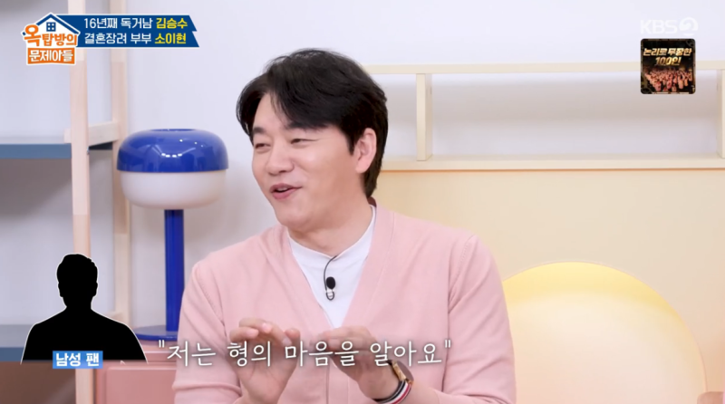 사진=KBS2김승수가긴독신생활에따른루머를해소했다.5일방송된KBS2예능‘옥탑방의문제아들’에는김승수,소이현이게스트출연했다.이날김승수는“이제는예능을하고나면서부터혼자사는모습을보여드리니까괜찮아졌는데전에는99%유부남으로오해했다”고고충을토로했다.이어그는“애도아주장성한줄알고.늦게술마시고있으면‘와이프랑애가기다리는데’라고어른들이야단치셨다”며“심지어술자리를하고있다가갑작스럽게지인여자분들이오실수있지않나.아는선배형님이나지인이옆에있는사람소개좀시켜달라고하면여자분들이정색하는얼굴이된다.대놓고바람을피우라고하는거라오해하는분이있다”고설명했다.홍진경이“성정체성에혼란이왔다던데”라고김승수를둘러싼‘게이설’도언급했다.그러자김승수는“여기서확실히말씀드리는데혼자오래있다보니까다양한생각을하시는분들이있다”면서“그중한남성팬에게편지를받았는데‘형,저는형의마음을알아요.저한테만털어놓으셔도돼요’라고하더라”라고말문을열었다.사진=KBS2그러면서“혹시커밍아웃할생각없는지물어본건데난절대아니다.세상에서여자가제일좋다.그건아니다”라고해명했다.이주인기자[email protected]©일간스포츠.무단전재및재배포금지.
